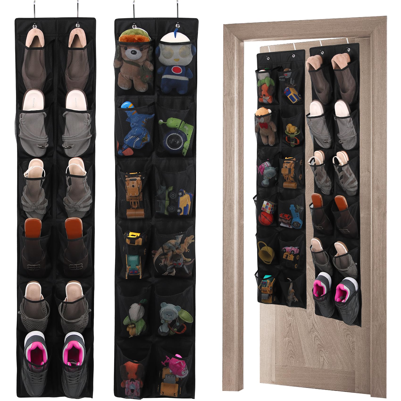 Over the Door Shoe Organizer, 12 Pocket, 2 Pack, Black, Mesh Storage for Shoes and Toys
