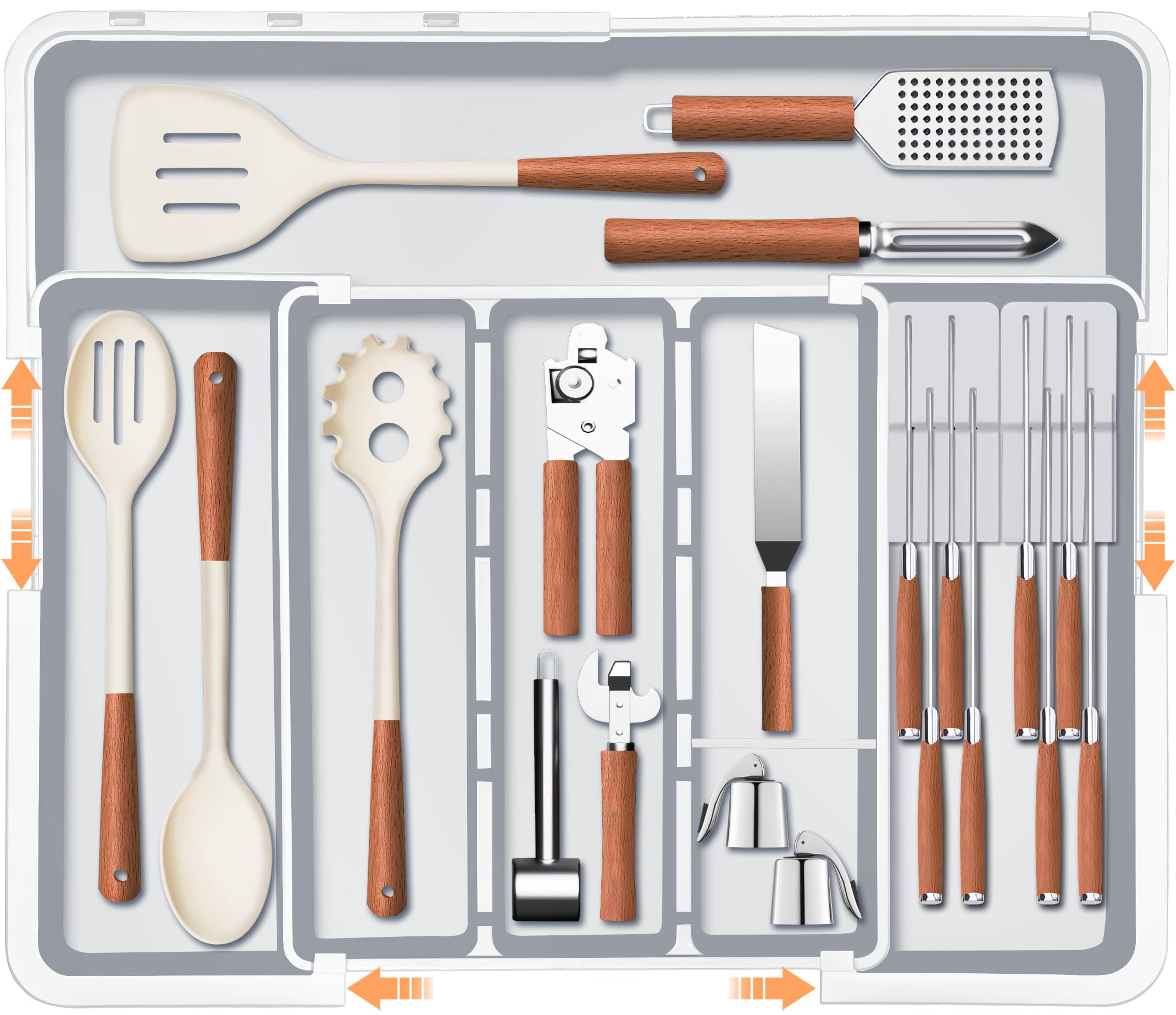 Homecor Organizador grande de utensilios para cajón de cocina, organizador de cubiertos expandible, bandeja de utensilios de cocin
