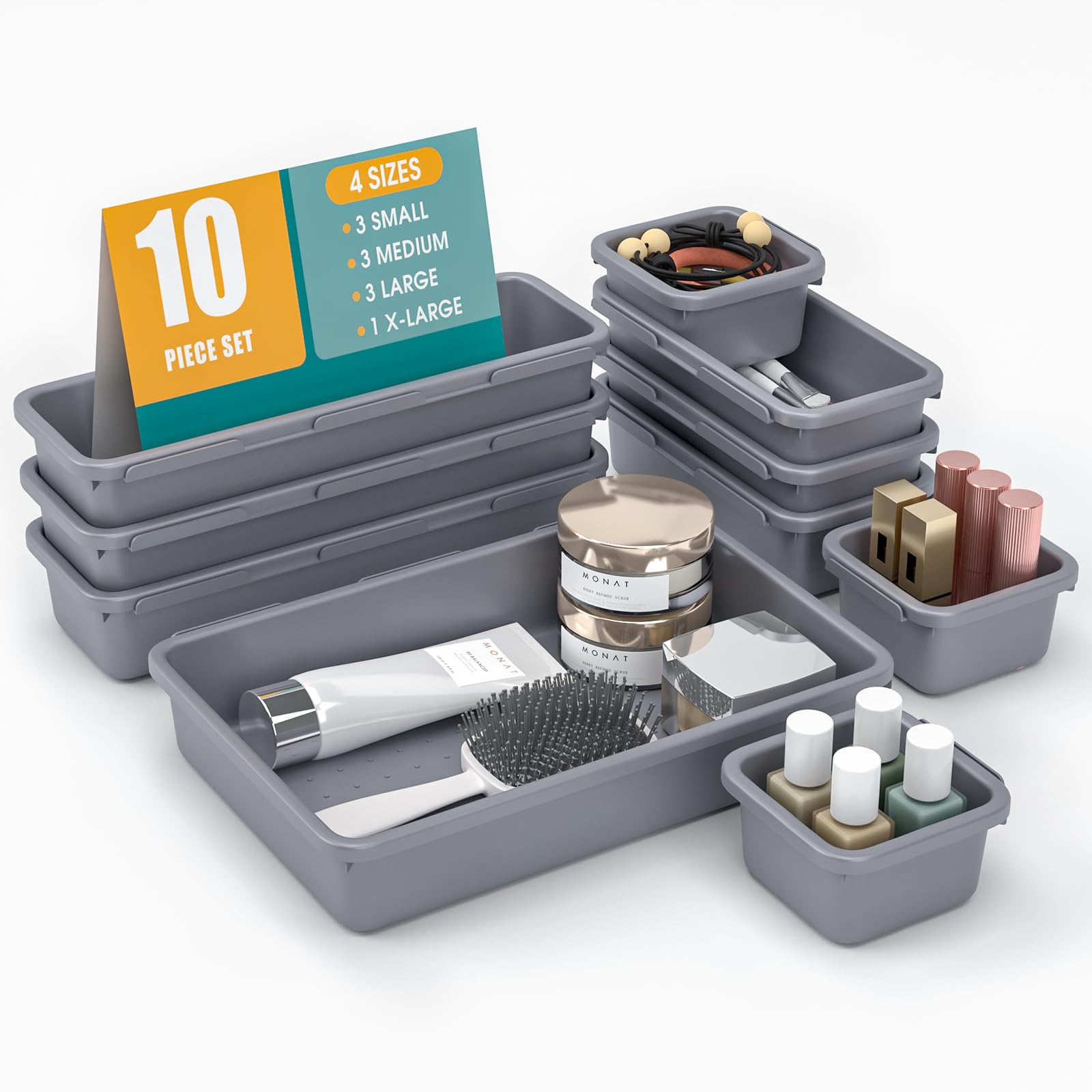 Juego de 10 organizadores de cajones, organizador de cajones de maquillaje de 4 tamaños con almohadillas antideslizantes, contened