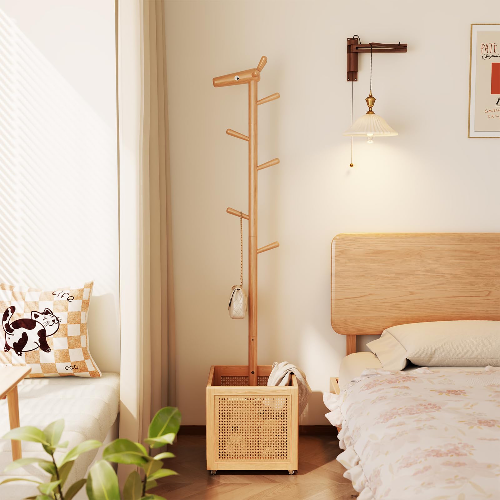 Bonito perchero de madera, perchero independiente con 5 ganchos, árbol de abrigo con cesta de almacenamiento para dormitorio, entr