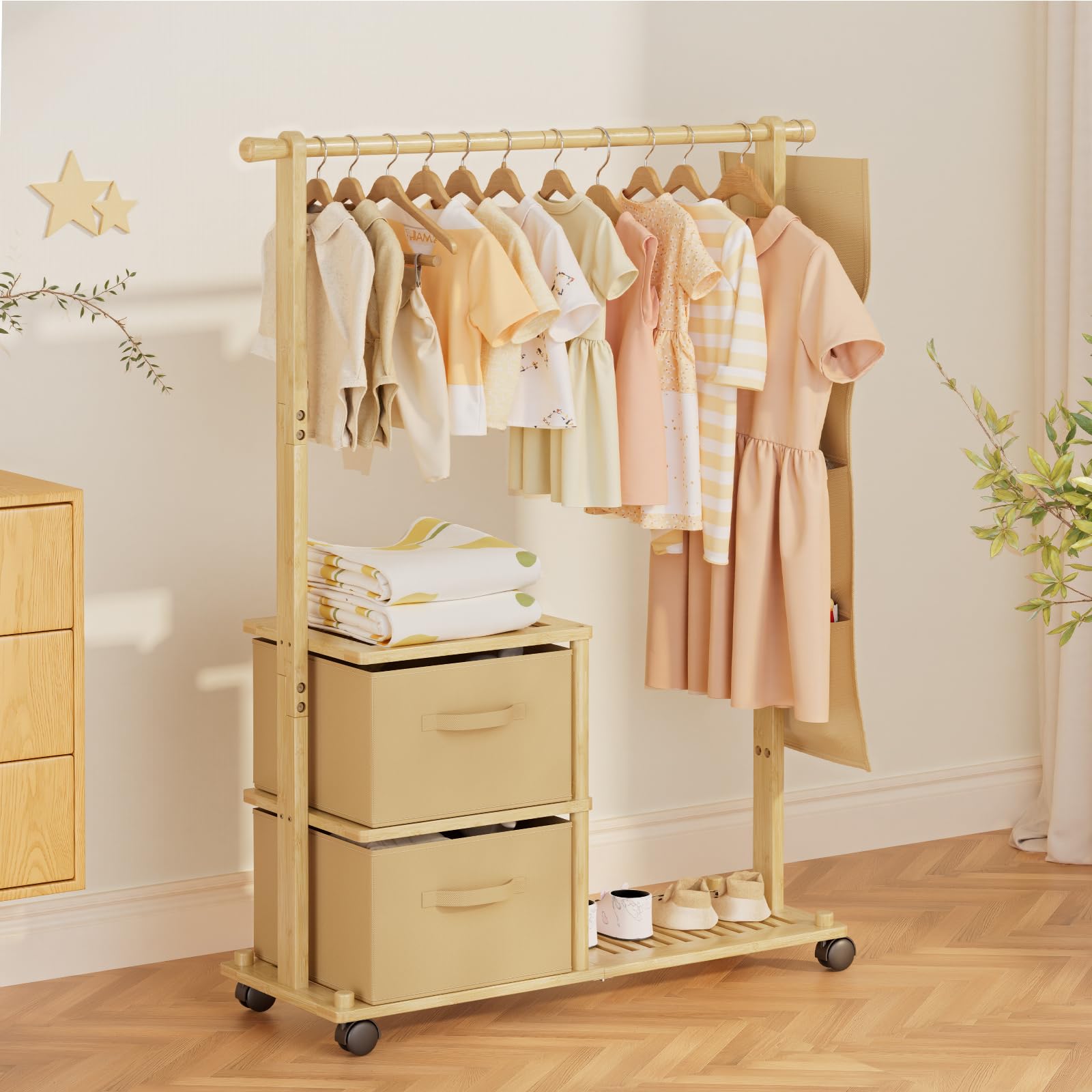 Amazer Perchero de ropa para niños, con 2 cajas de almacenamiento y bolsa para colgar, perchero de una sola barra, estante de ropa