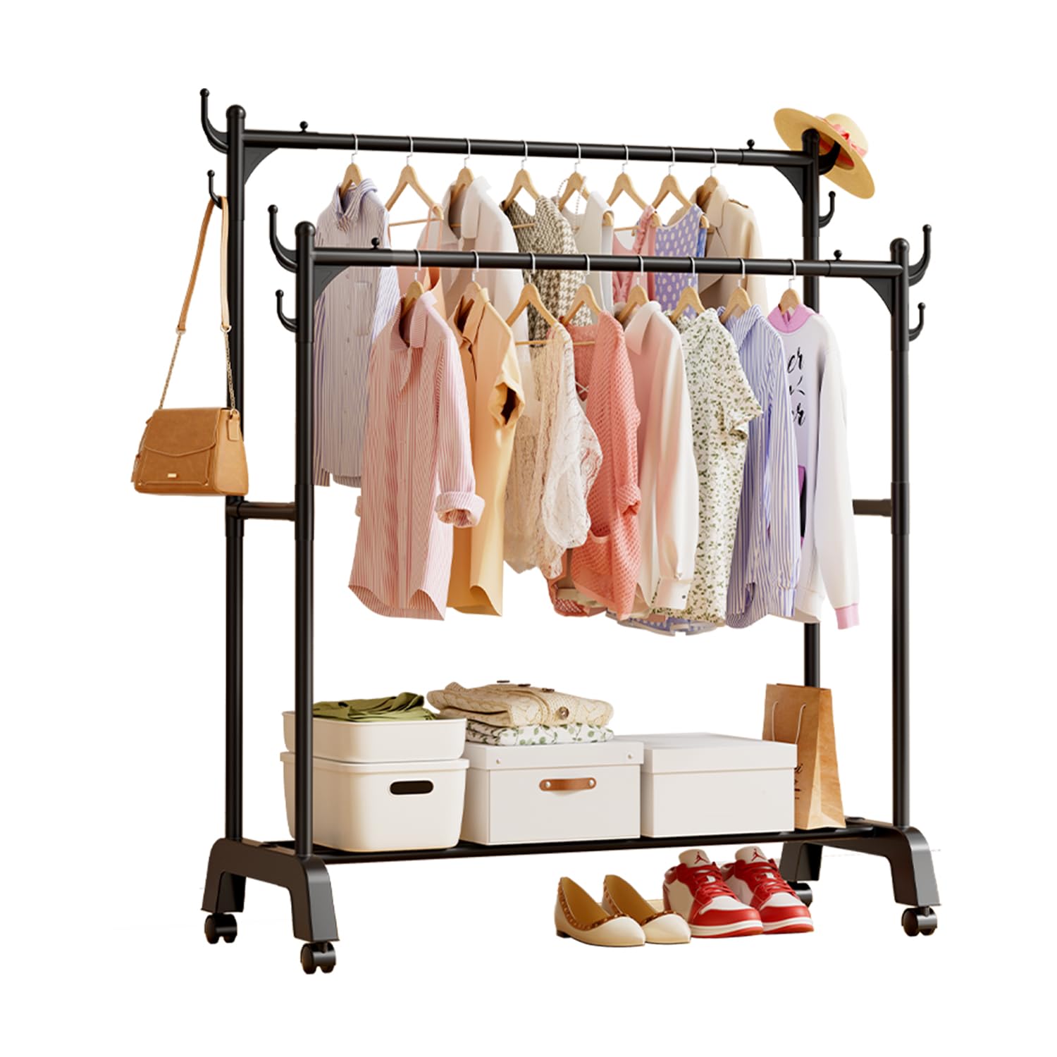 Perchero de ropa de doble barra con ruedas, perchero ajustable con estantes inferiores barra extensible, organizador de ropa plega