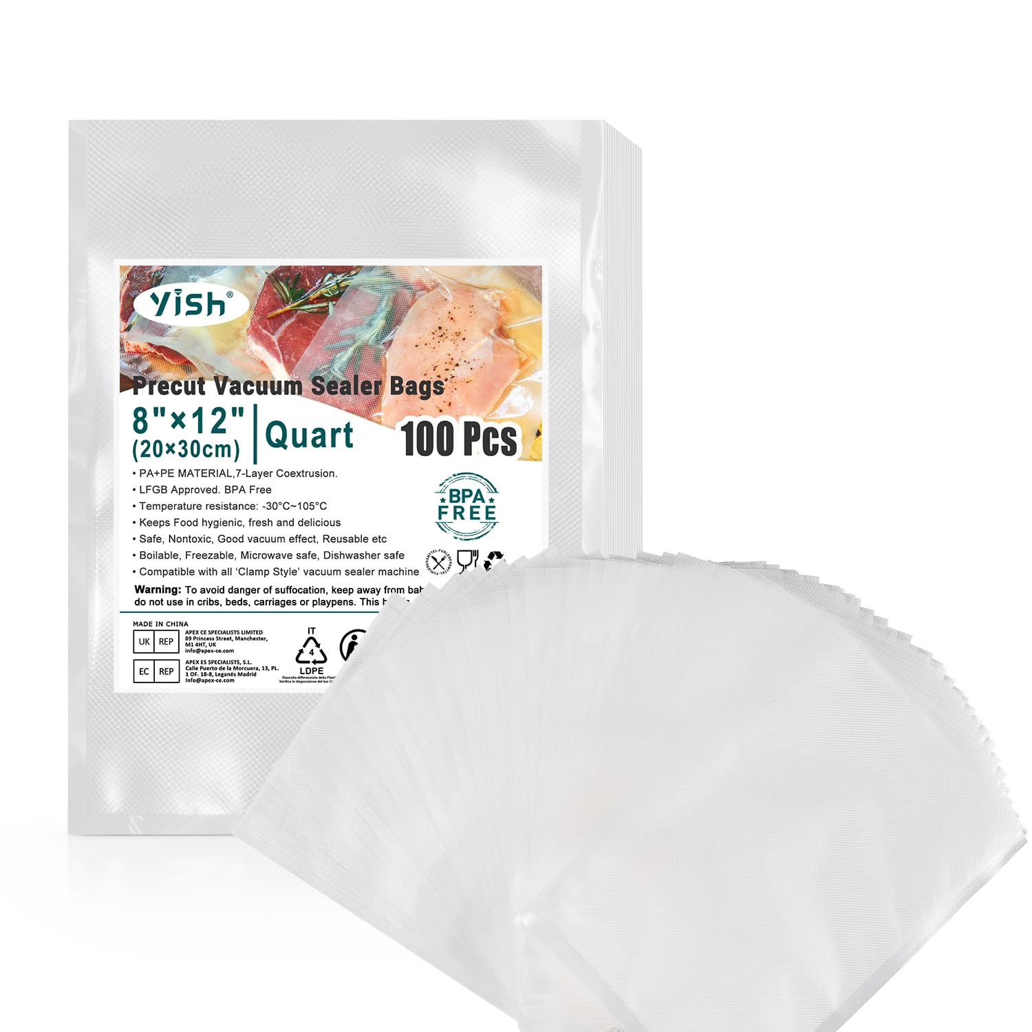 YISH Bolsas selladoras al vacío de cuarto de galón: 100 bolsas precortadas de 8 “x 12” para guardar alimentos, sin BPA, reutilizab
