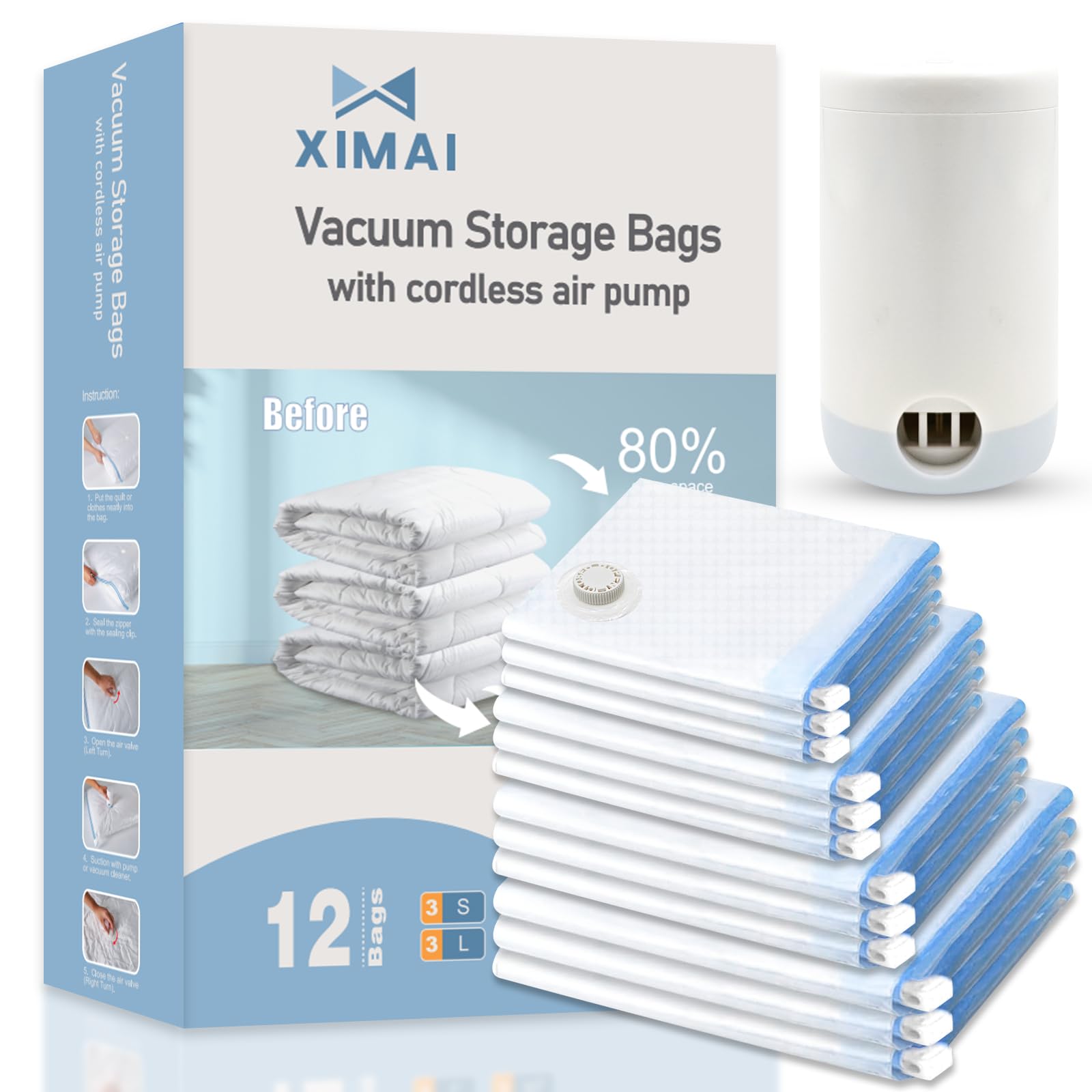 XIMAI Bolsas de almacenamiento al vacío con bomba eléctrica para ropa, 12 bolsas de sellado combinado para ropa, ahorro de espacio