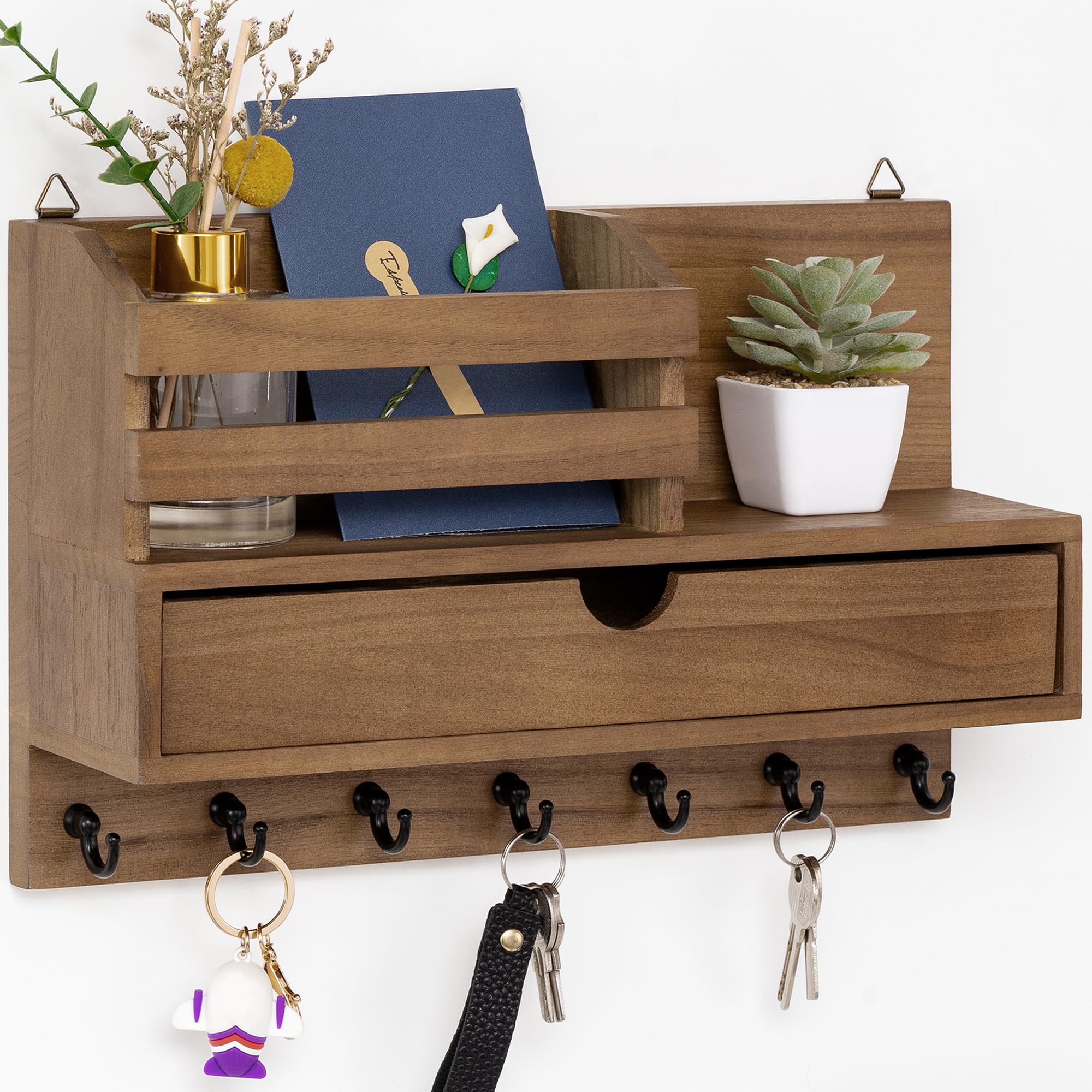 Soporte para llaves y correo para pared, organizador de correo con 6 ganchos y cajón de almacenamiento, colgador de madera para ll