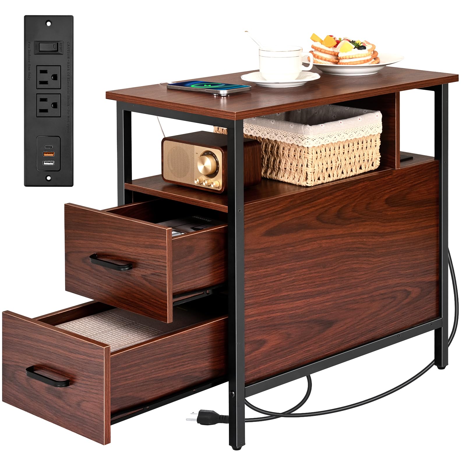 Mesas laterales estrechas con estación de carga, mesa auxiliar estrecha con cajones de madera, puertos USB y tomas de corriente, m