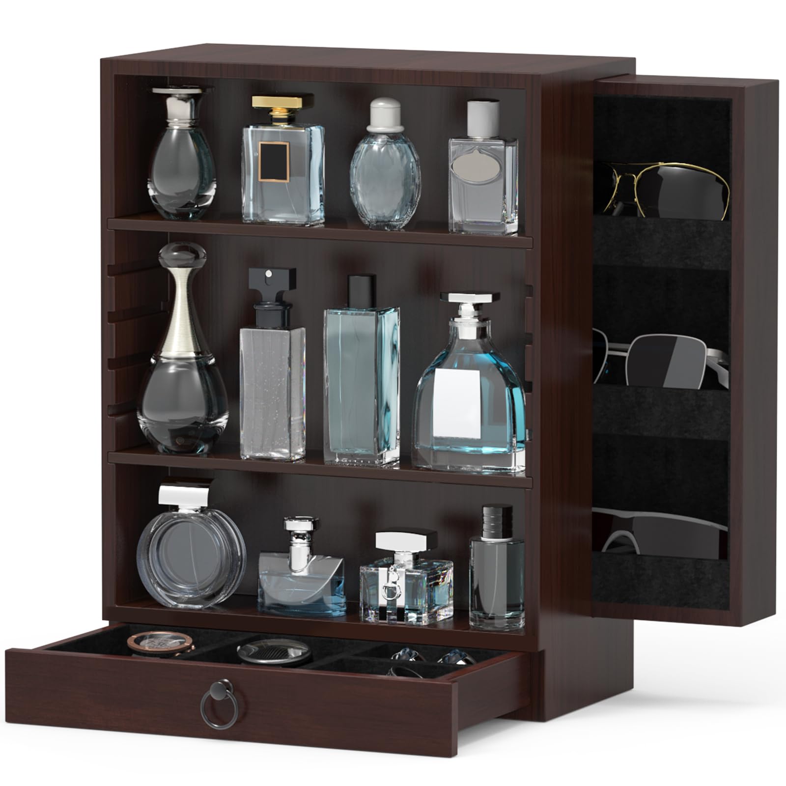 Organizador de colonia de madera para hombres, soporte deslizante de 4 niveles de exhibición de perfume de pie con cajones lateral