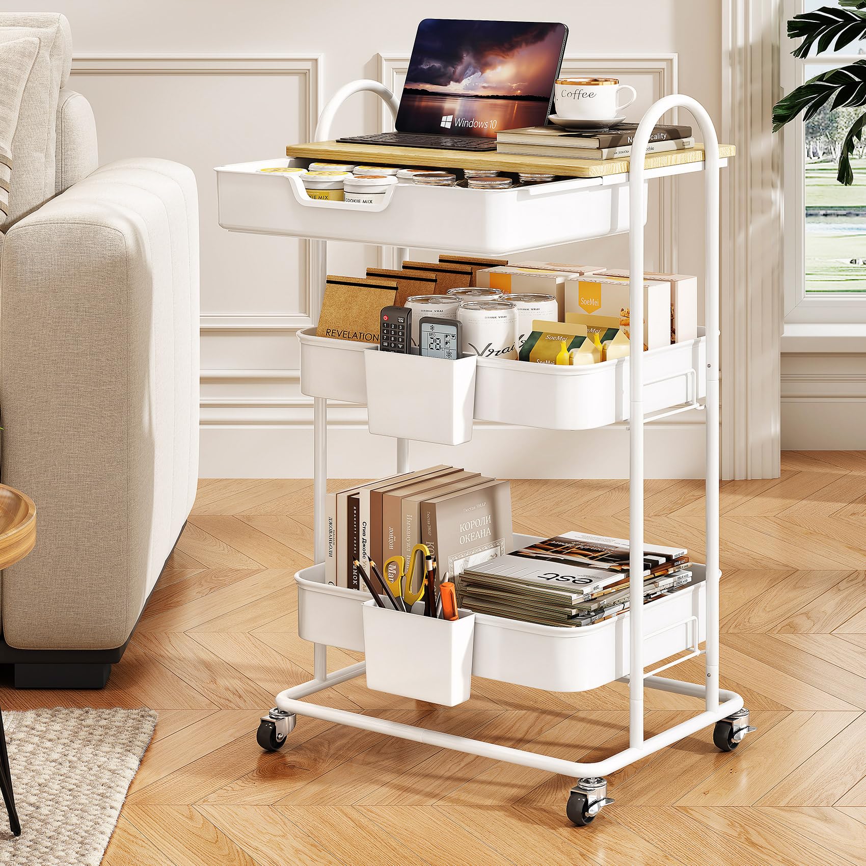 SNTD 3 Tier Utility Rolling Cart with Wheels – Smooth Sliding Drawers, Wooden Tabletop, Hanging Buckets for Kitchen, Art Room, Off
