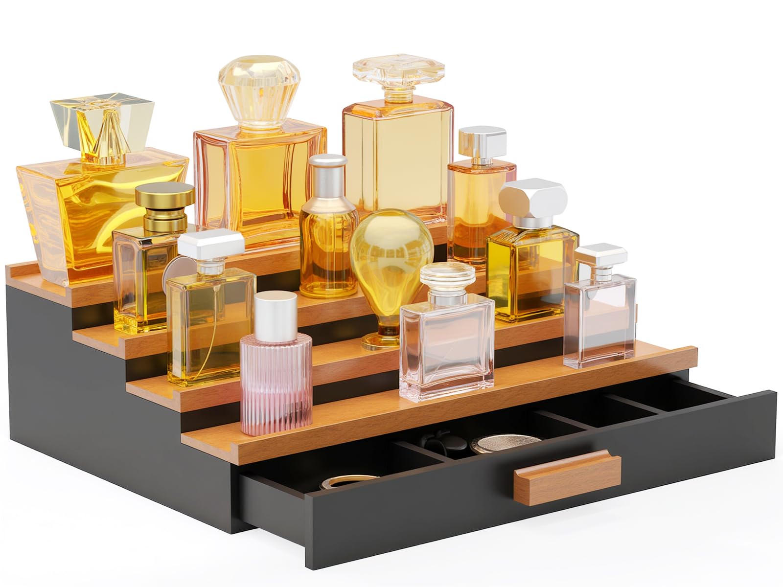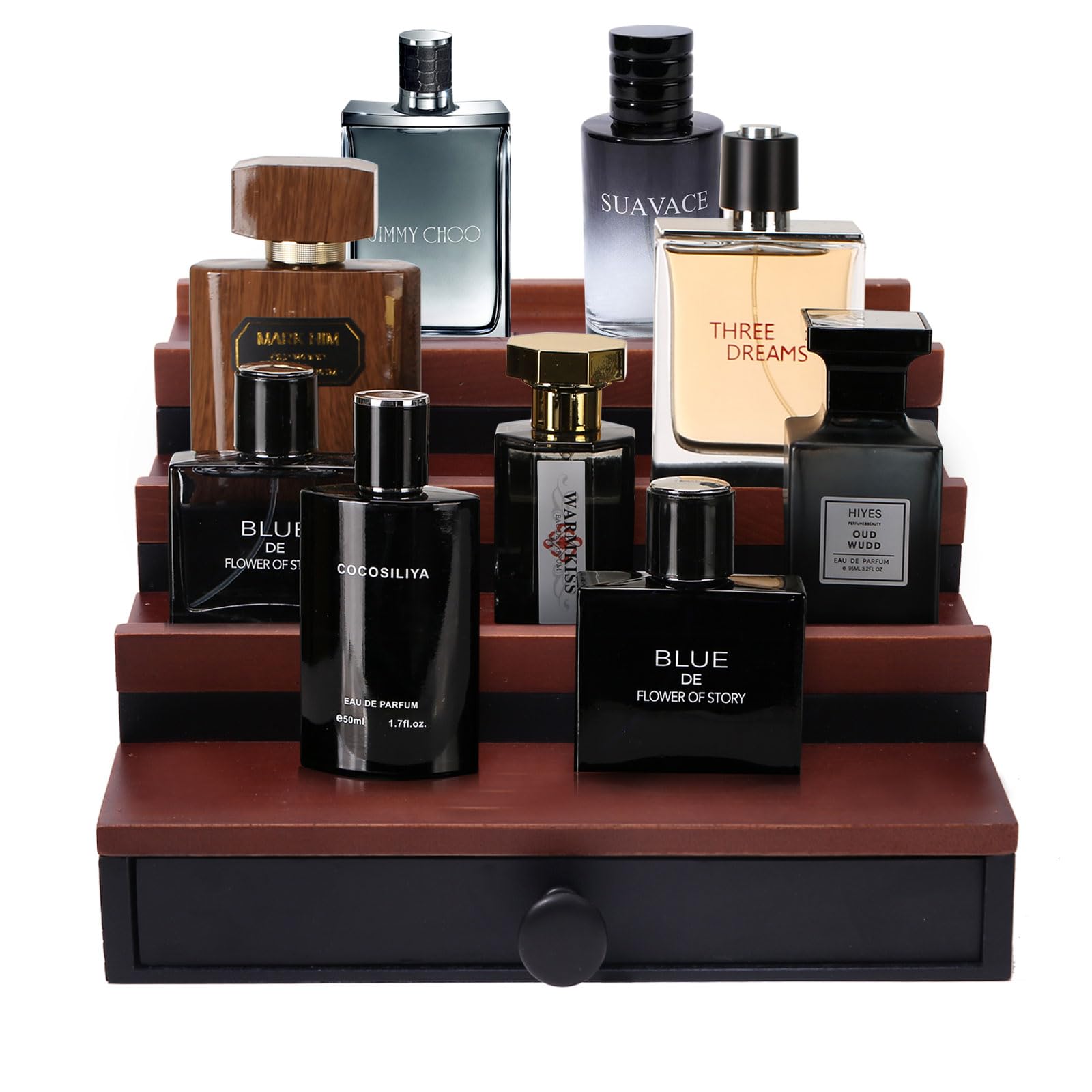 ONKO Organizador de colonia de madera para hombres, soporte de colonia de 4 niveles, estante de colonia con cajón y compartimento