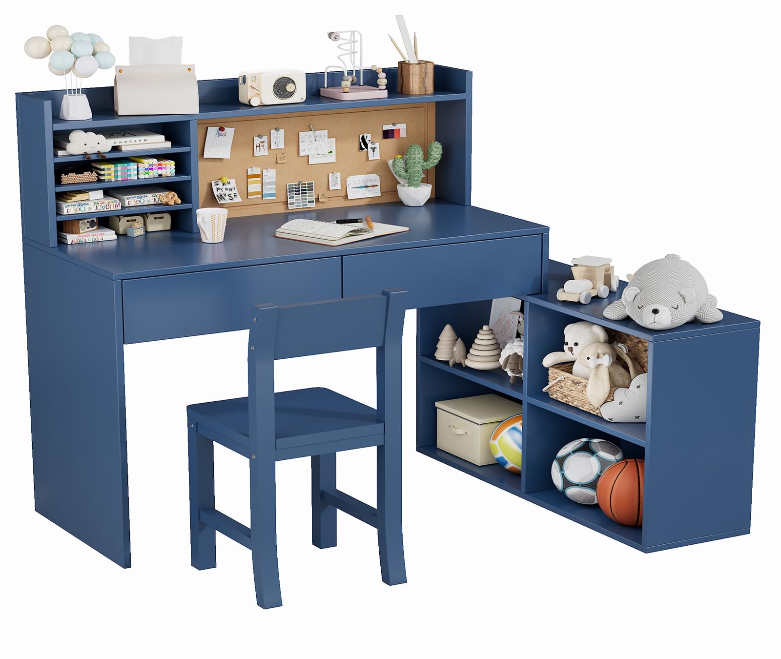 NTU9XC – Juego de escritorio y silla de madera azul para niños, mesa de estudio y sillas con 2 dibujos y 4 gabinetes, escritorio d