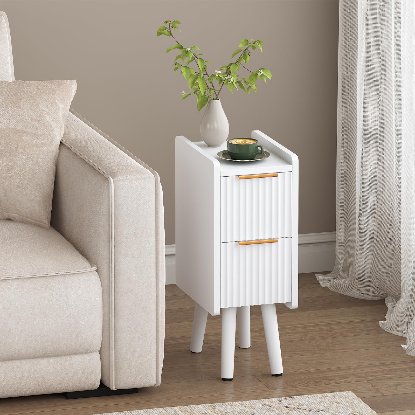 ELYKEN Mesa auxiliar estrecha, mesita de noche acanalada con cajones, mesa auxiliar pequeña de madera para espacios pequeños, mesi