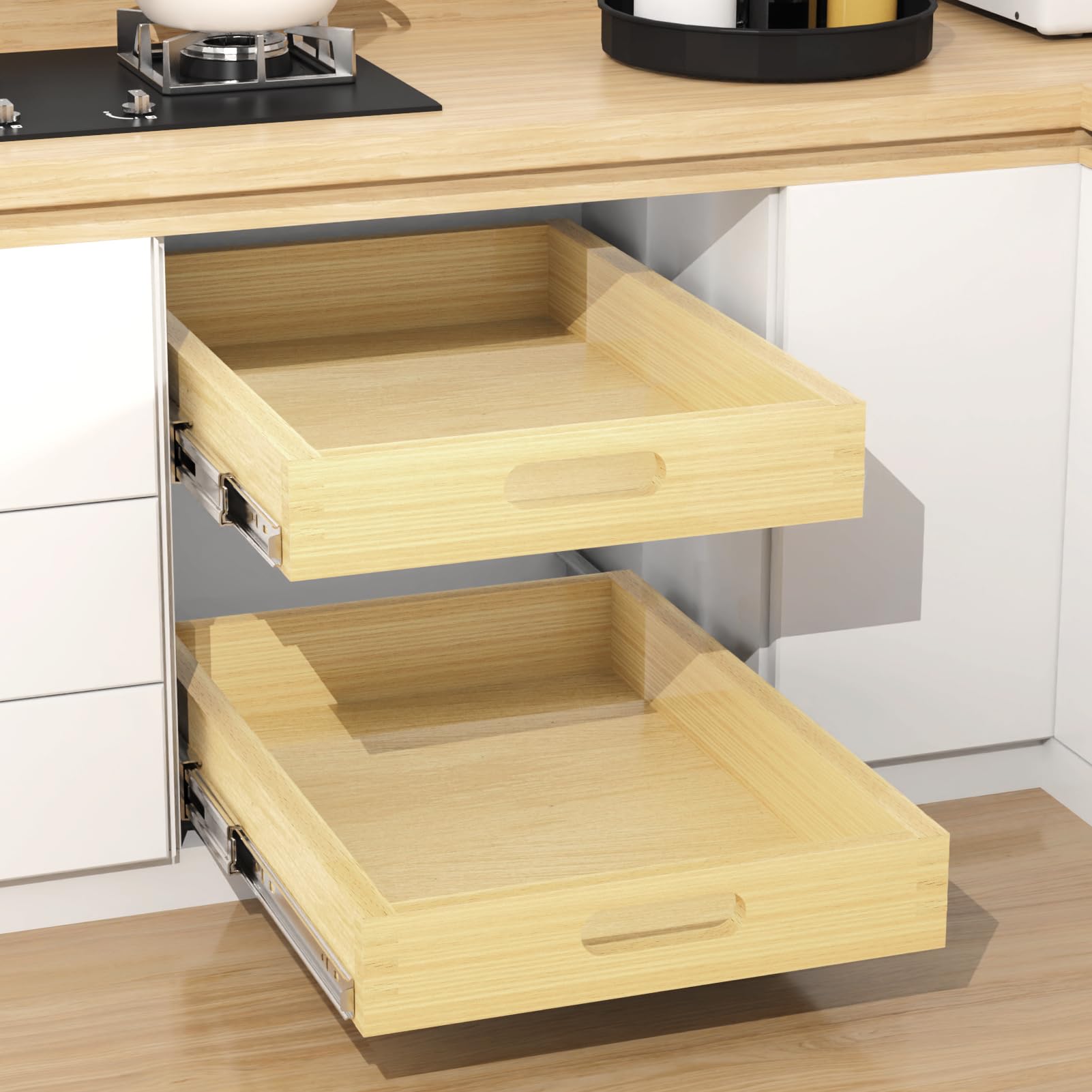 Juego de 2 bandejas extraíbles para gabinete, cajones de madera, estante de despensa deslizante para gabinete base, cocina, cierre