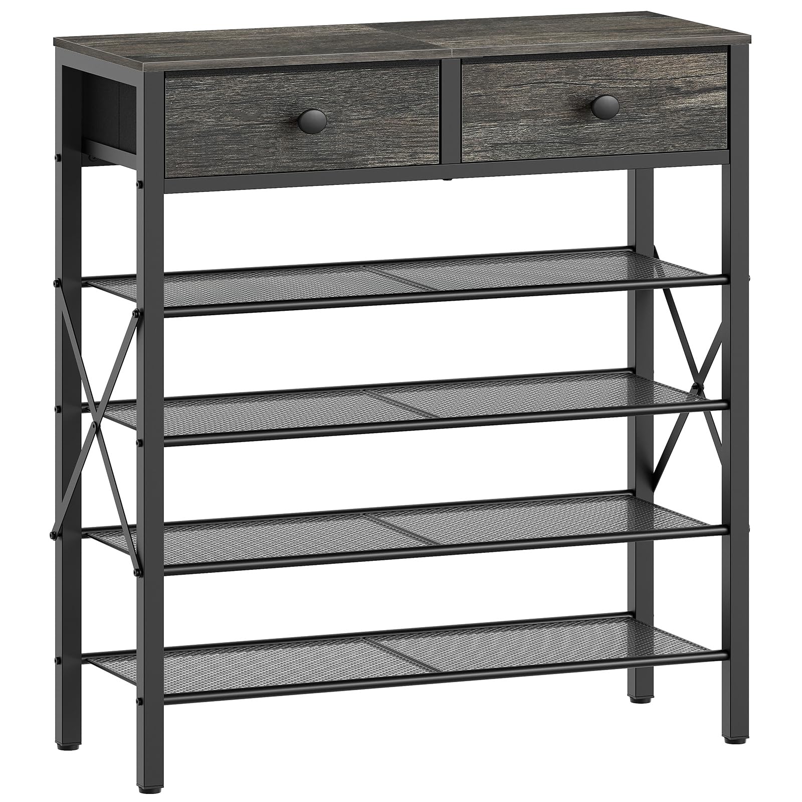 Zapatero de 5 niveles con 2 cajones de tela, marco de metal y tablero de madera organizador de zapatos para 16-20 pares de zapatos