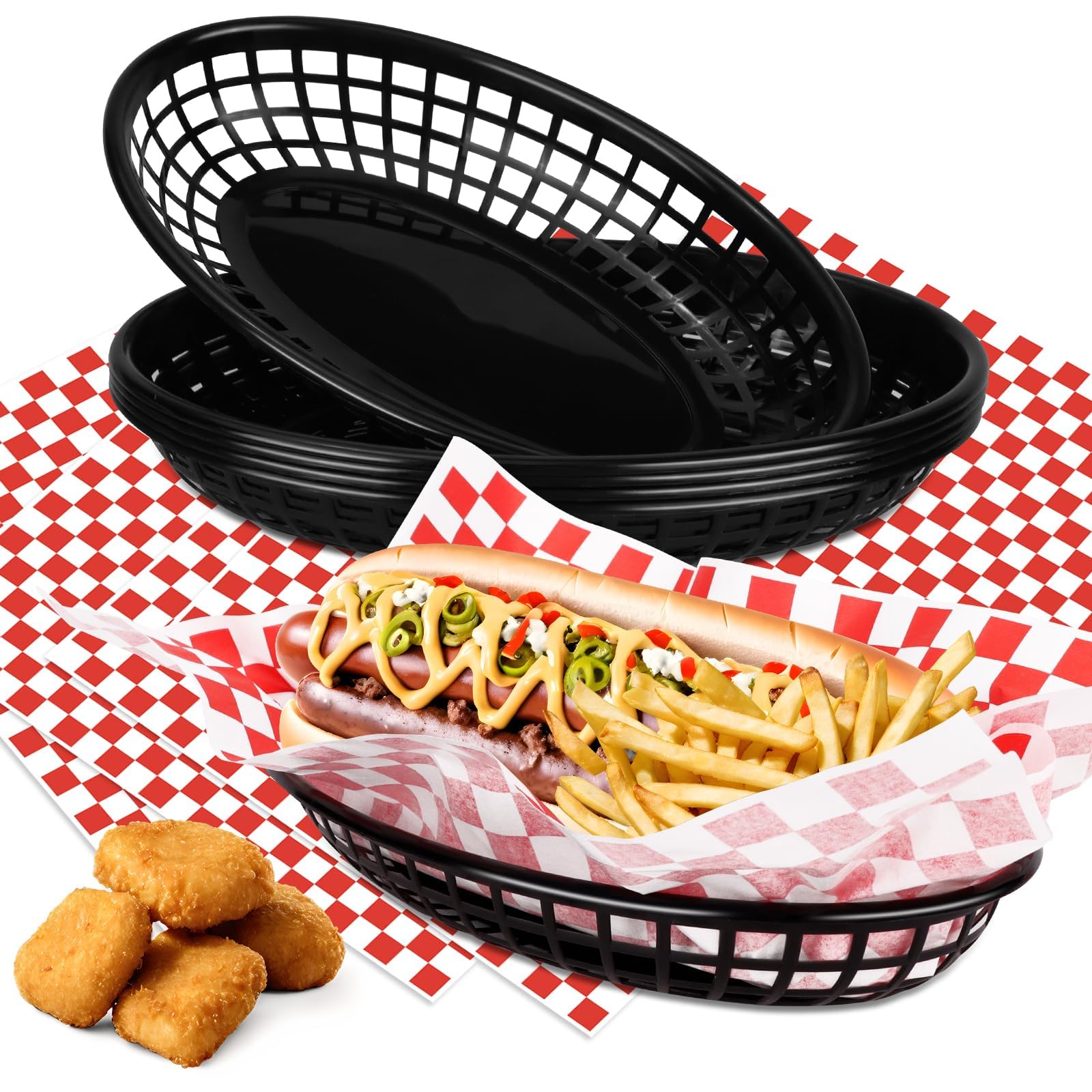120 hojas de forros de delicatessen a cuadros rojos y 12 cestas negras de comida rápida, cestas clásicas con papel encerado seco a