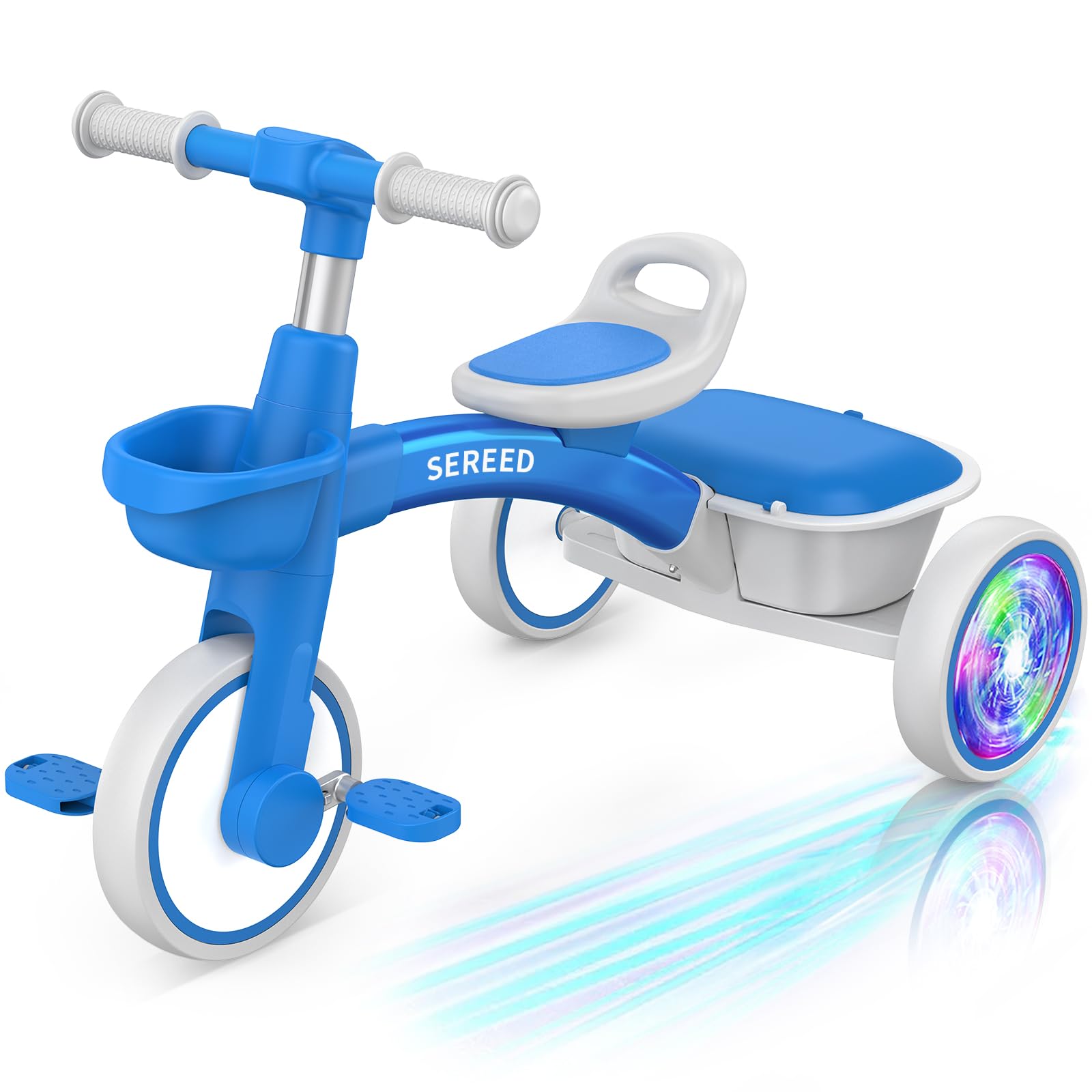 SEREED Colorful Lighting – Triciclo para niños de 2 a 5 años de edad, triciclo ajustable con asiento y manillar, cesta extraíble,