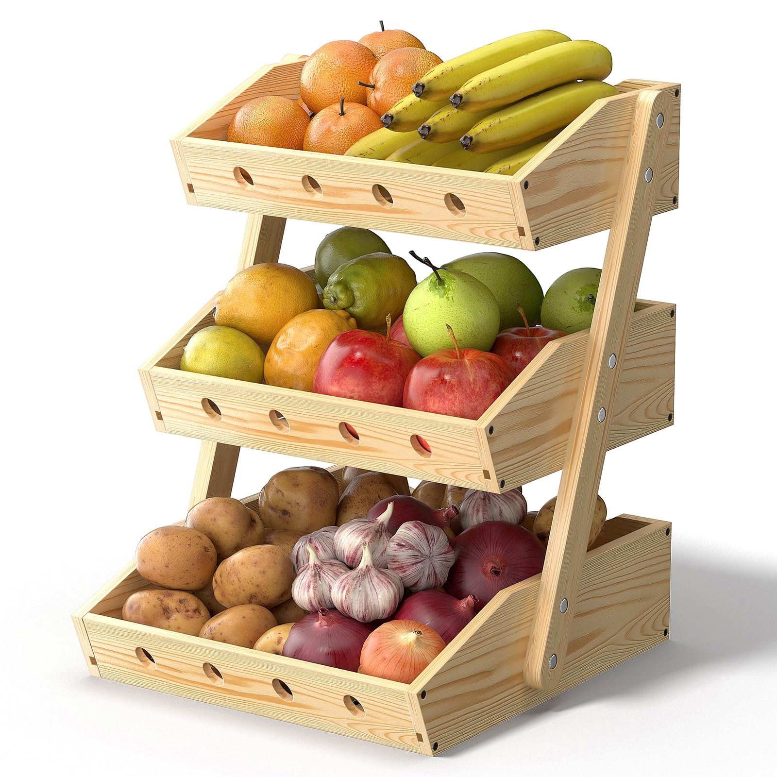 Cesta de frutas de madera de 3 niveles para mostrador, fruteros, organizador de almacenamiento de frutas y verduras de gran capaci