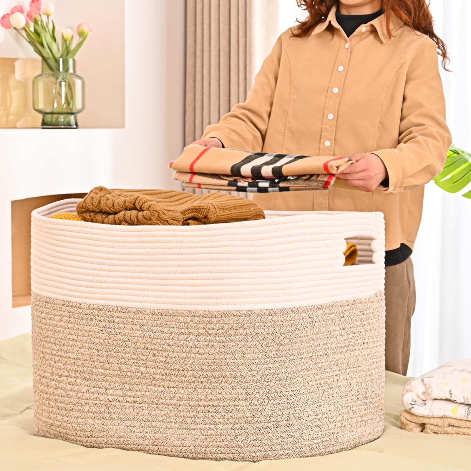 Cesta de lavandería extra grande, cesta de manta de 95 litros para sala de estar, cesta de almacenamiento de cuerda de algodón, ca