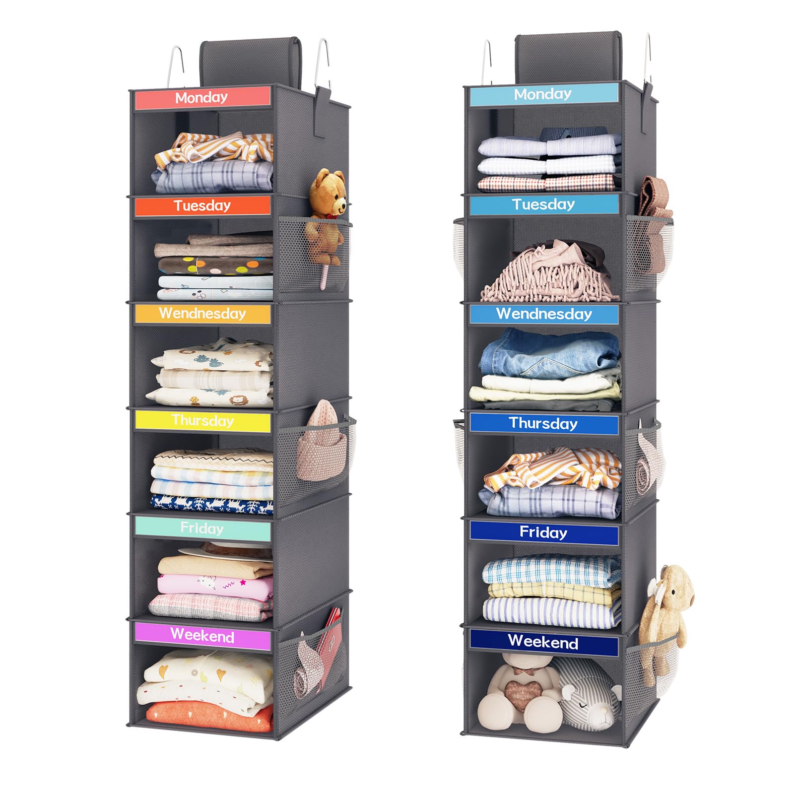Fixwal Paquete de 2 organizadores semanales de ropa de 6 estantes para niños, estante diario para colgar en el armario con 6 bolsi