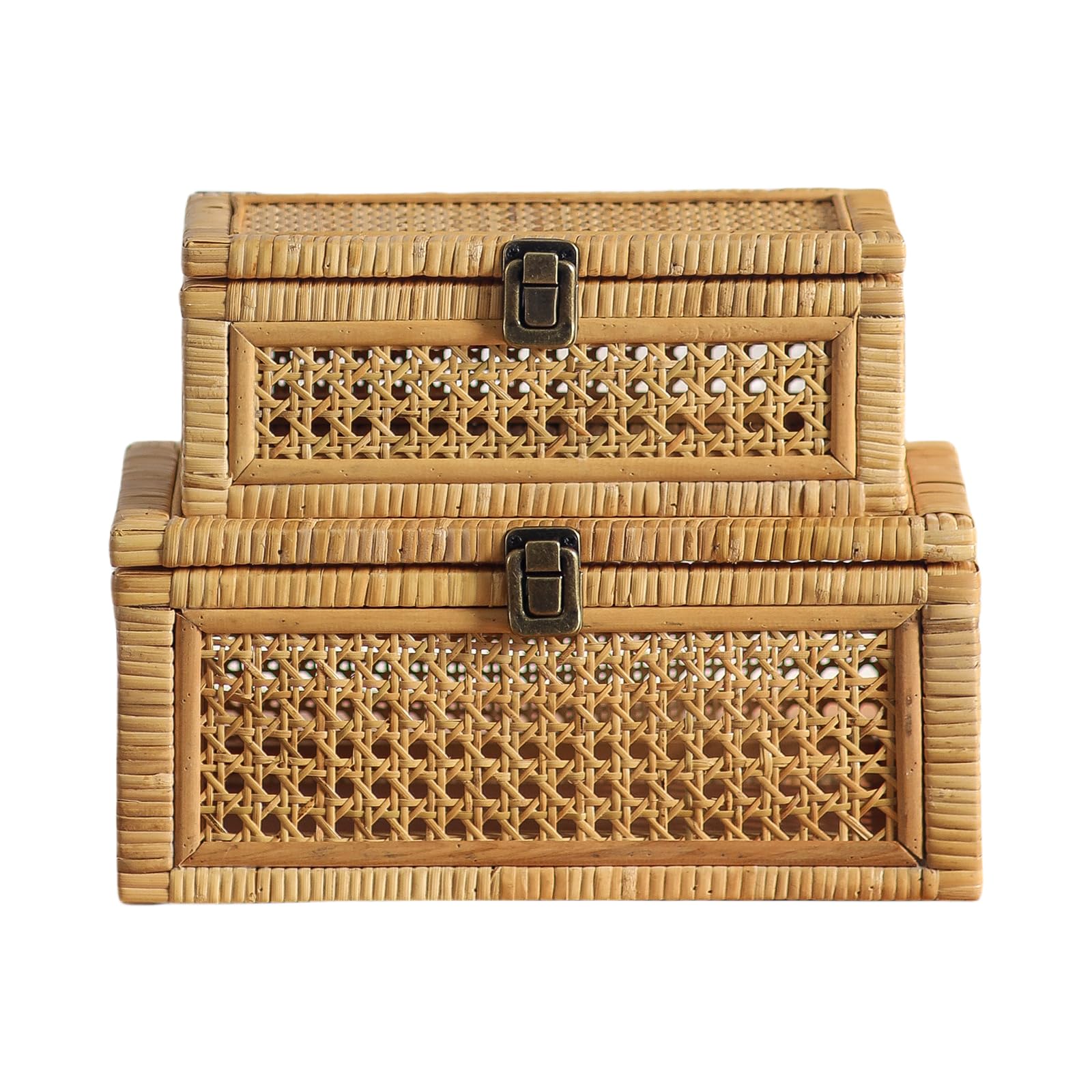 Cajas de exhibición de ratán bohemio tejidas a mano con tapas de vidrio, juego de 2 contenedores de almacenamiento rectangulares d