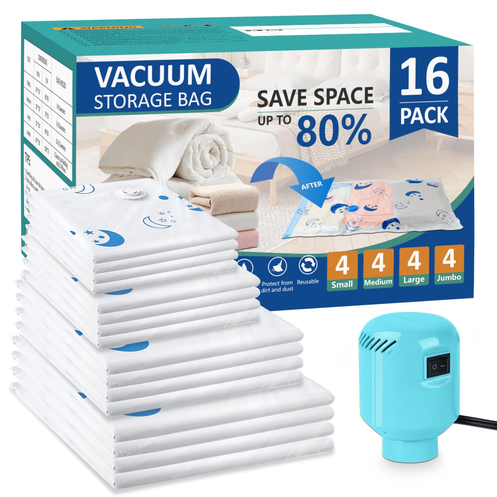 Bolsas de sellado al vacío para ropa con bomba eléctrica, paquete de 16 bolsas ahorradoras de espacio (4 jumbo, 4 grandes, 4 media