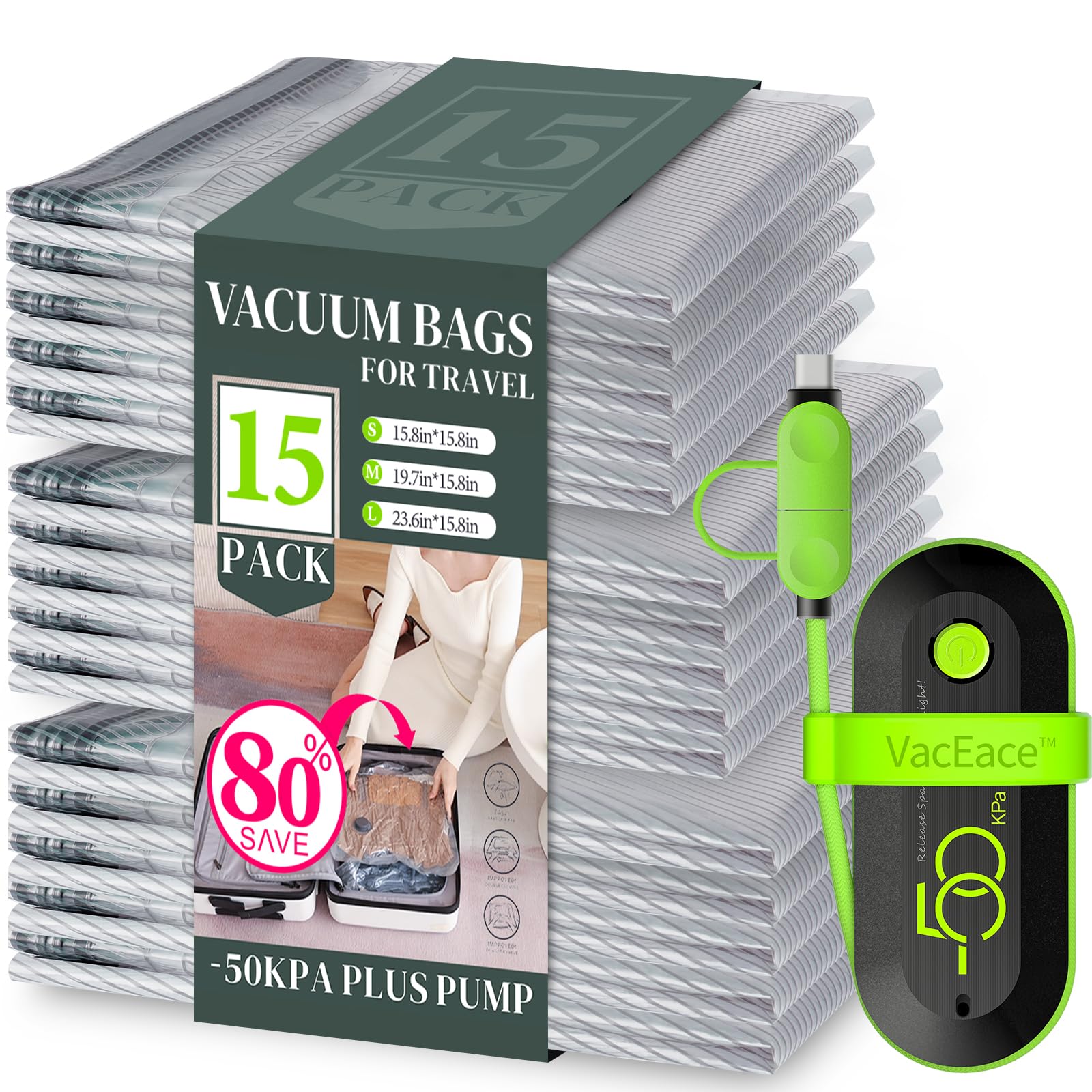 Bolsas de almacenamiento al vacío de viaje con bomba eléctrica USB, paquete de 15 bolsas de compresión de viaje para equipaje y ma
