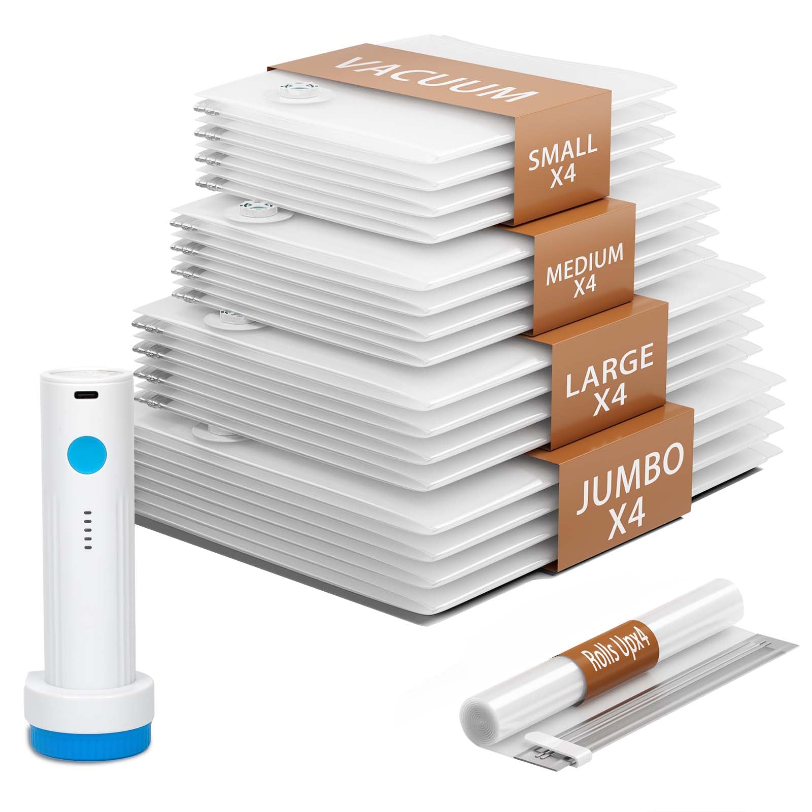 Paquete de 16 bolsas de almacenamiento al vacío con bomba de mano, 4 jumbo + 4 grandes + 4 medianas + 4 bolsas de embalaje de plás