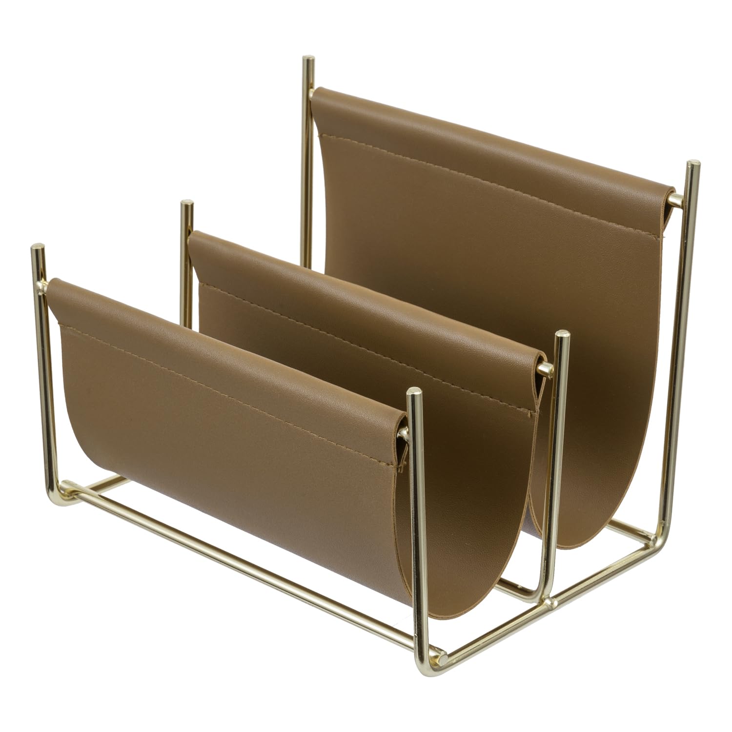 MyGift Revistero moderno de mediados de siglo de 15 pulgadas con marco de metal en tono latón y eslinga de piel sintética marrón c