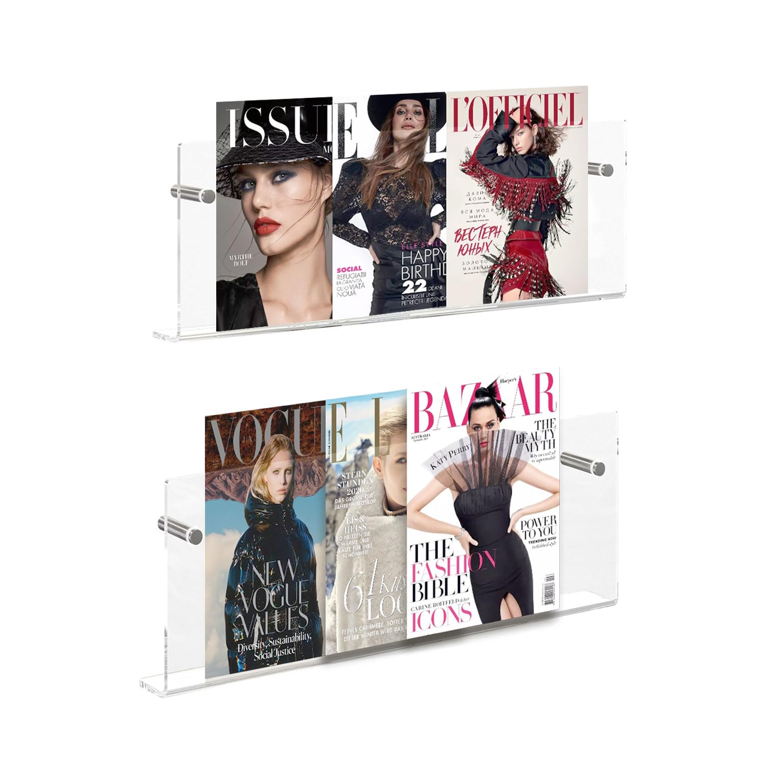 Paquete de 2 revistas de acrílico transparente, estante de montaje en pared, estante para revistas, estante de exhibición de folle