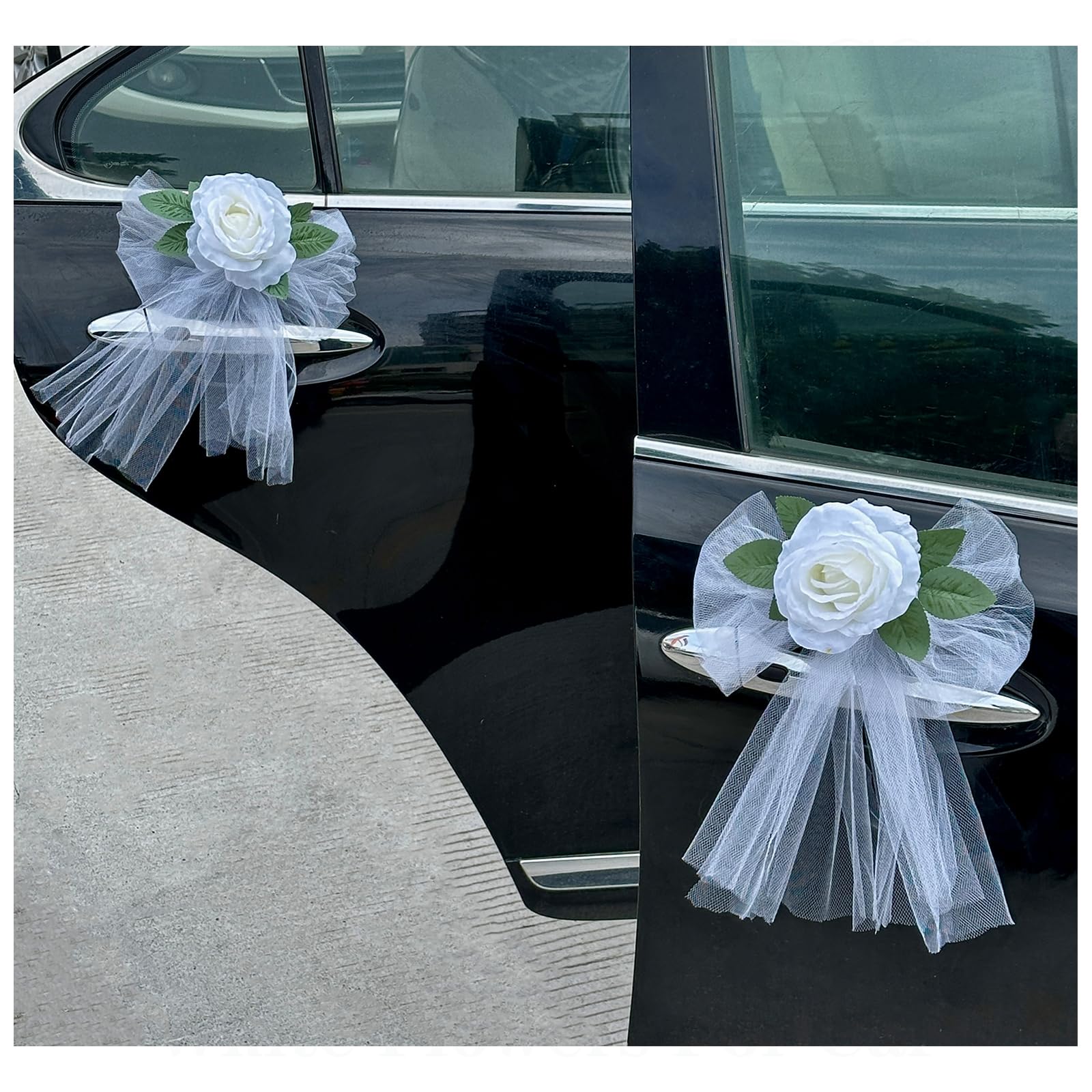 Elegante decoración de manija de puerta de coche de boda con rosas blancas – Flor artificial de 4.7 in con hoja, lazo de tul blanc