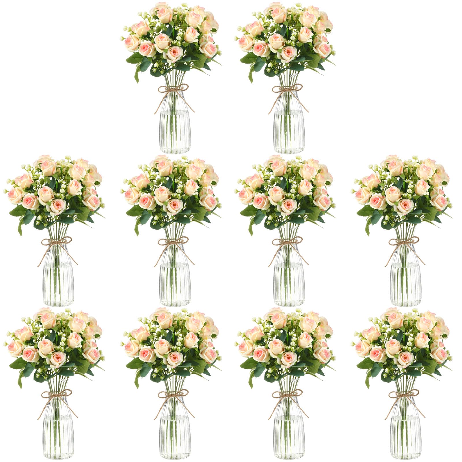 Zeyune 20 Pcs Fake Flowers with 10 Vase, Artificial Silk Roses in Clear Vase, Plant Table Centerpiece Decorations for Wedding, Hom