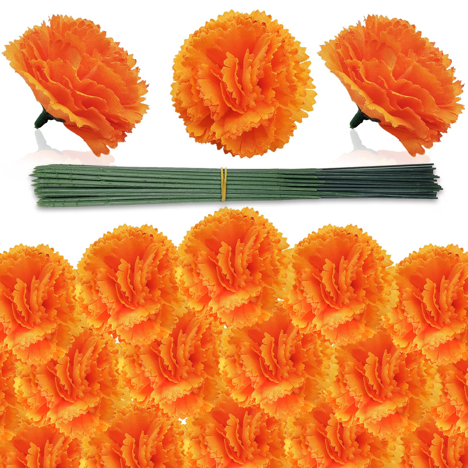 Marigold Flowers Artificial – Premium Silk Flower Heads with 30 Stems for Diwali Decorations for Home, Day of The Dead Altar, Hand