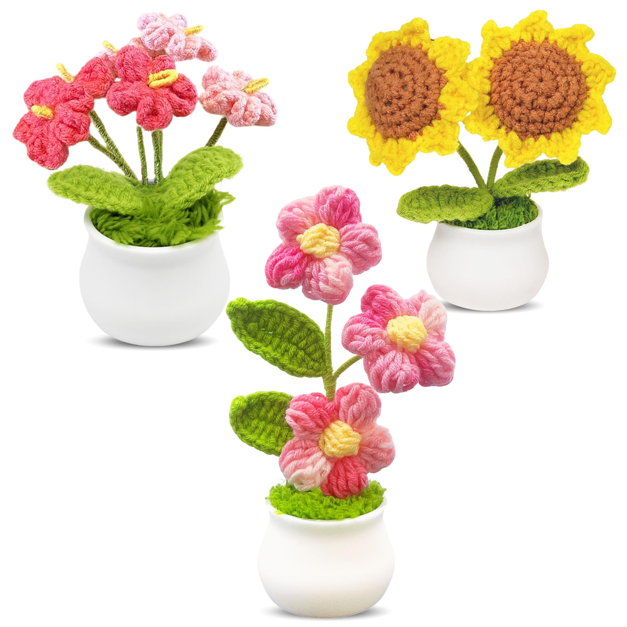 3pcs Crochet Flowers Cute Potted Flower,Mini Flower Bouquet for Mom Wife, Cute Desk Decor for Women,Artificial Handmade Flowers fo