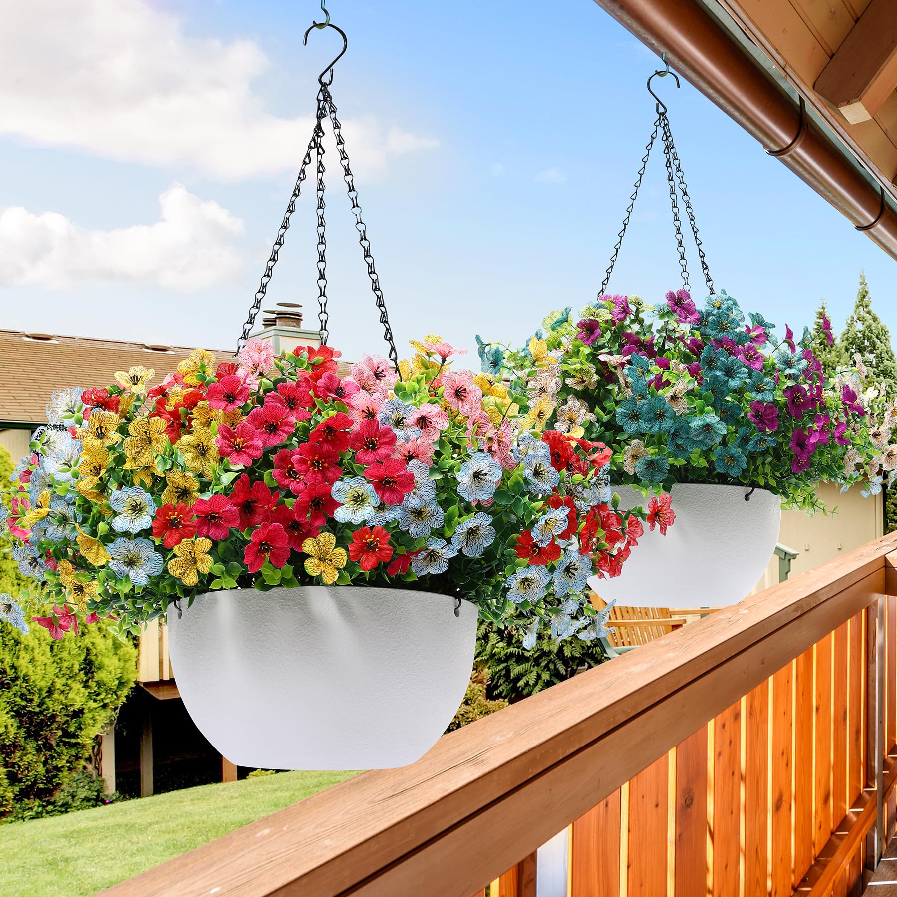 Cesta de flores artificiales colgantes para exteriores, paquete de 2 macetas colgantes con 30 margaritas de seda falsa resistentes