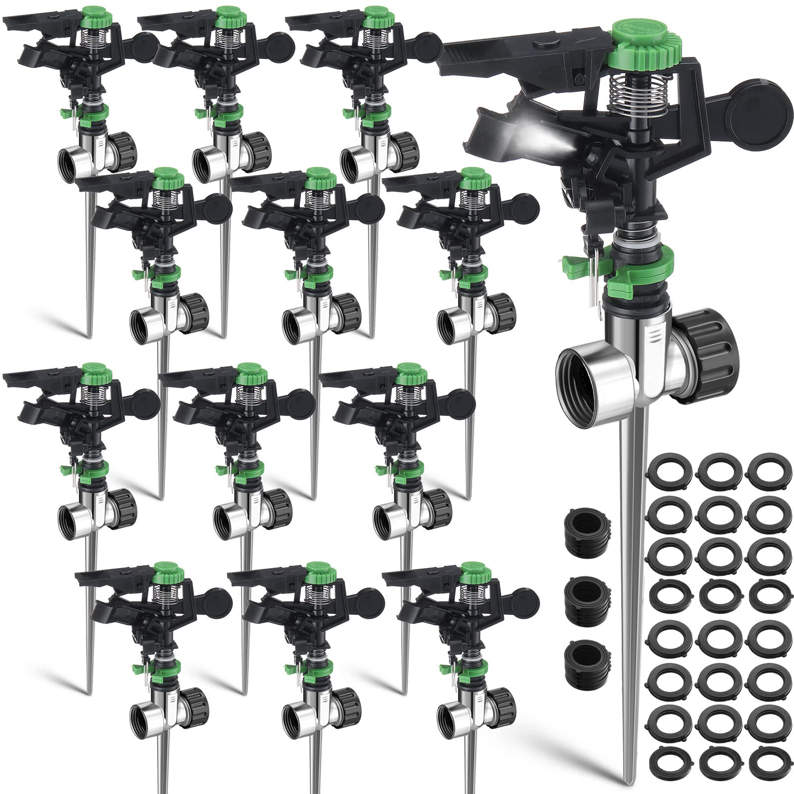 Rociador de impacto giratorio de metal pulsante para área grande para patio, césped, jardín (12, negro y verde)