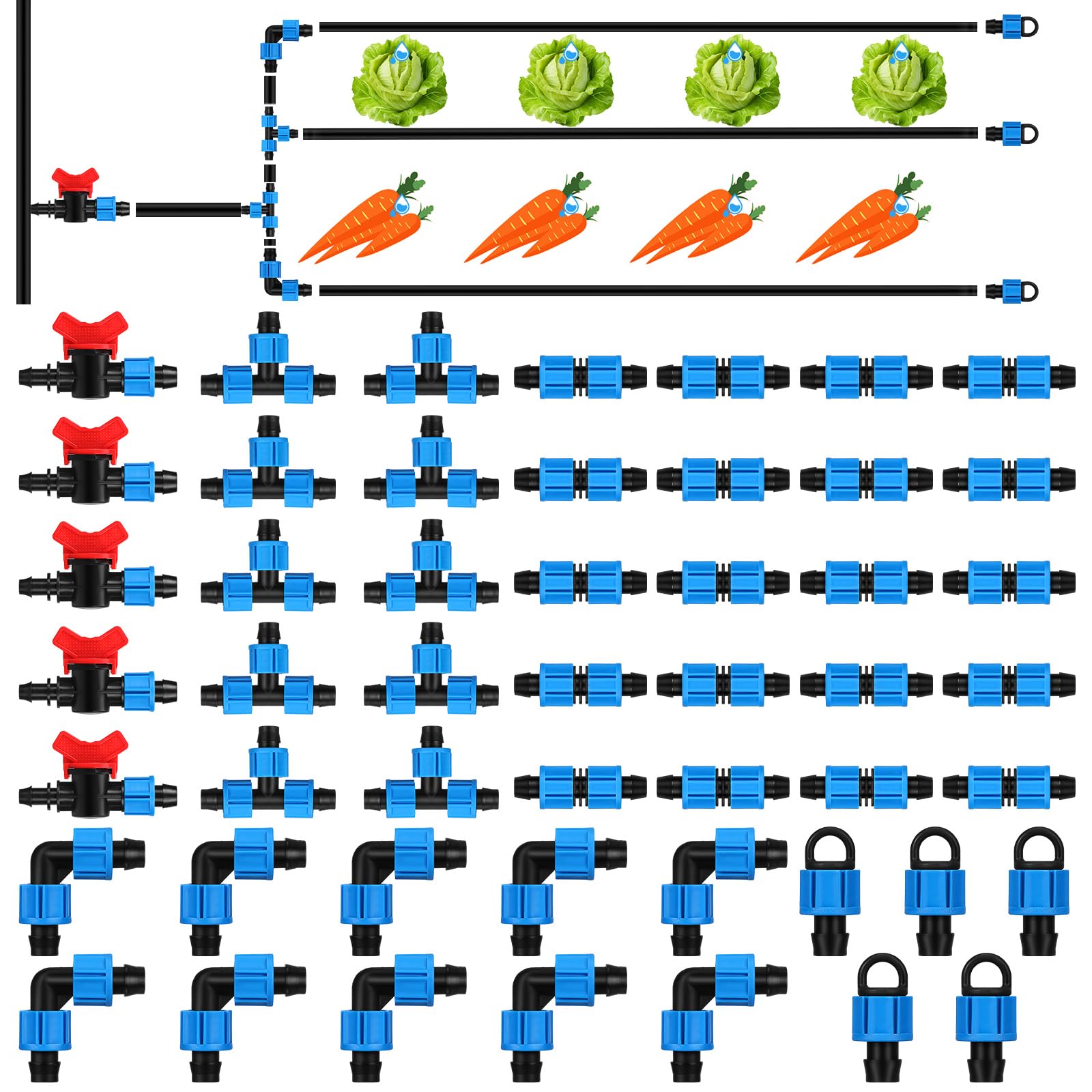 Kit de 52 accesorios de riego por goteo, 50 acoplamientos de riego por goteo 5/8 (10 codos, 10 camisetas, 10 acoplamientos, 10 cla
