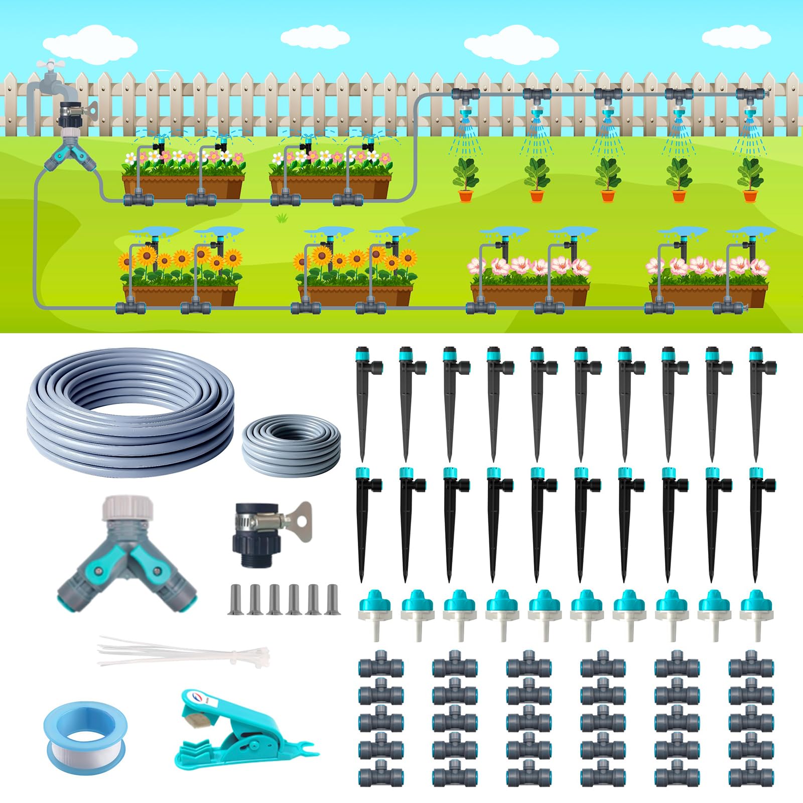 Sistema de riego por goteo, sistema de riego de jardín de 120 pies con accesorios de conexión rápida, kit de riego por goteo con m