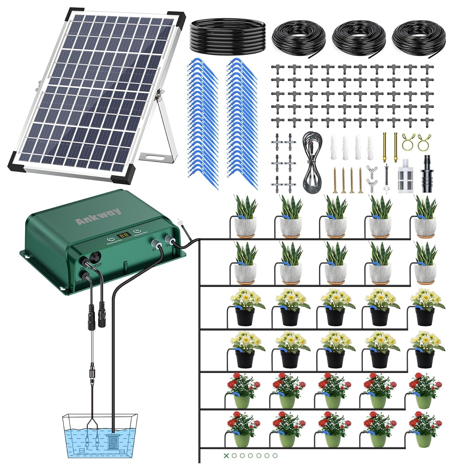Ankway Kit de riego por goteo automático solar de 10 W, sistema de riego automático alimentado por energía solar, juego de riego a