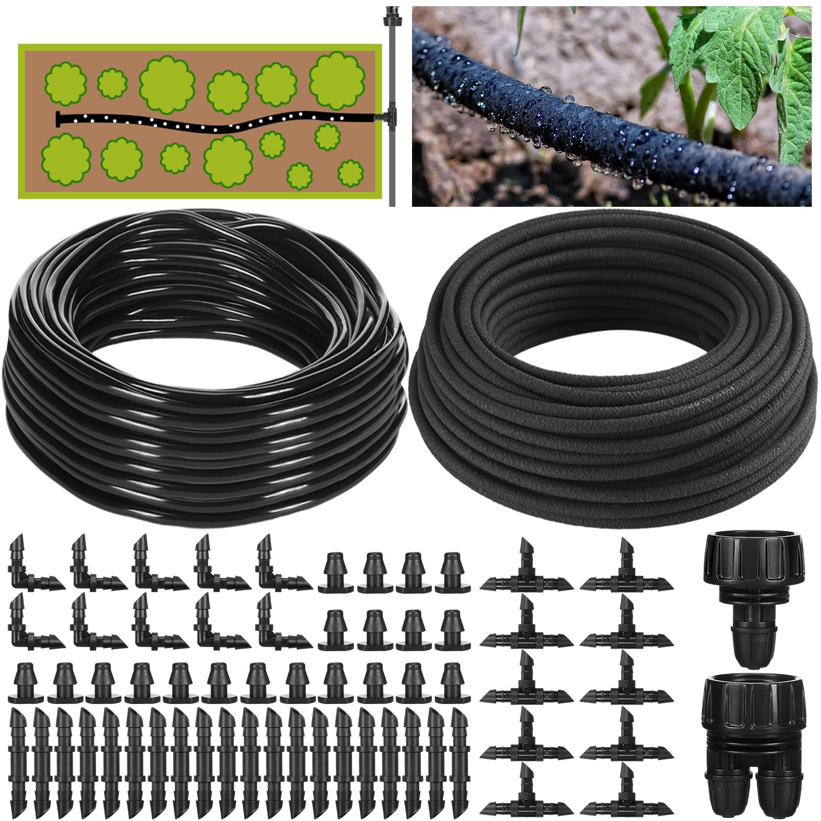 Kit de riego por goteo, manguera de remojo de 1/4 de pulgada, tubo de riego por goteo de 200 pies y 1/4 de pulgada, 100 pies con v
