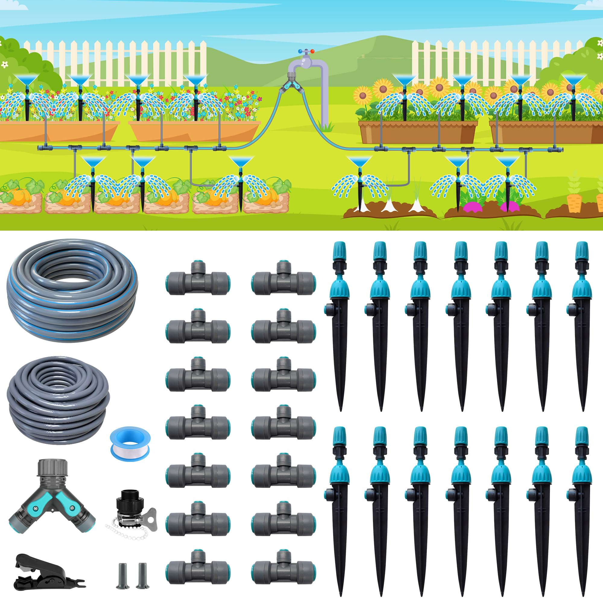 Dianrui Sistema de riego automático de jardín curvado de 360°: sistema de riego por goteo de 50 pies para jardín, sistema de rocia