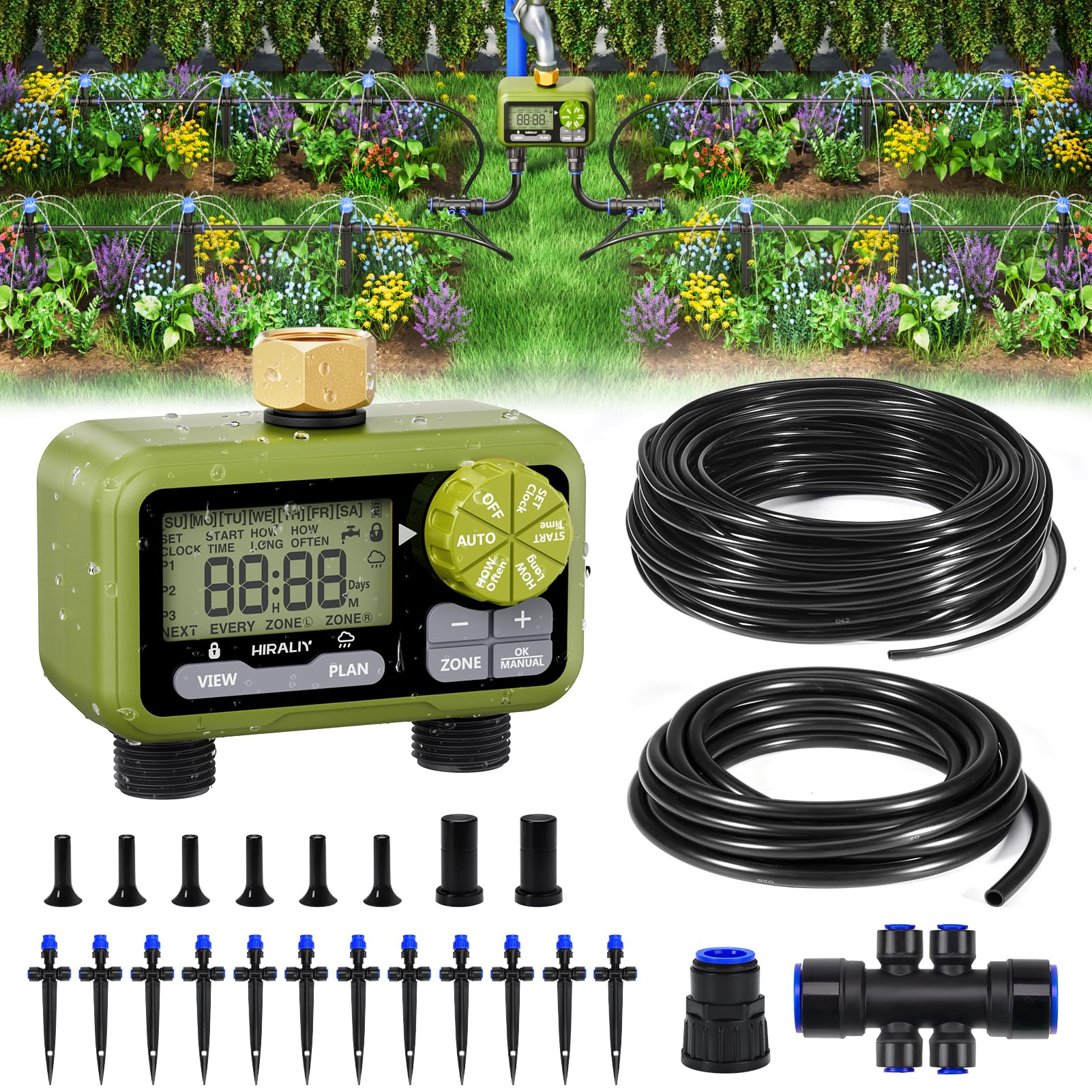 HIRALIY Kit de riego por goteo de 50 pies con temporizador de agua de jardín, 2 zonas, sistema automático de riego de jardín para