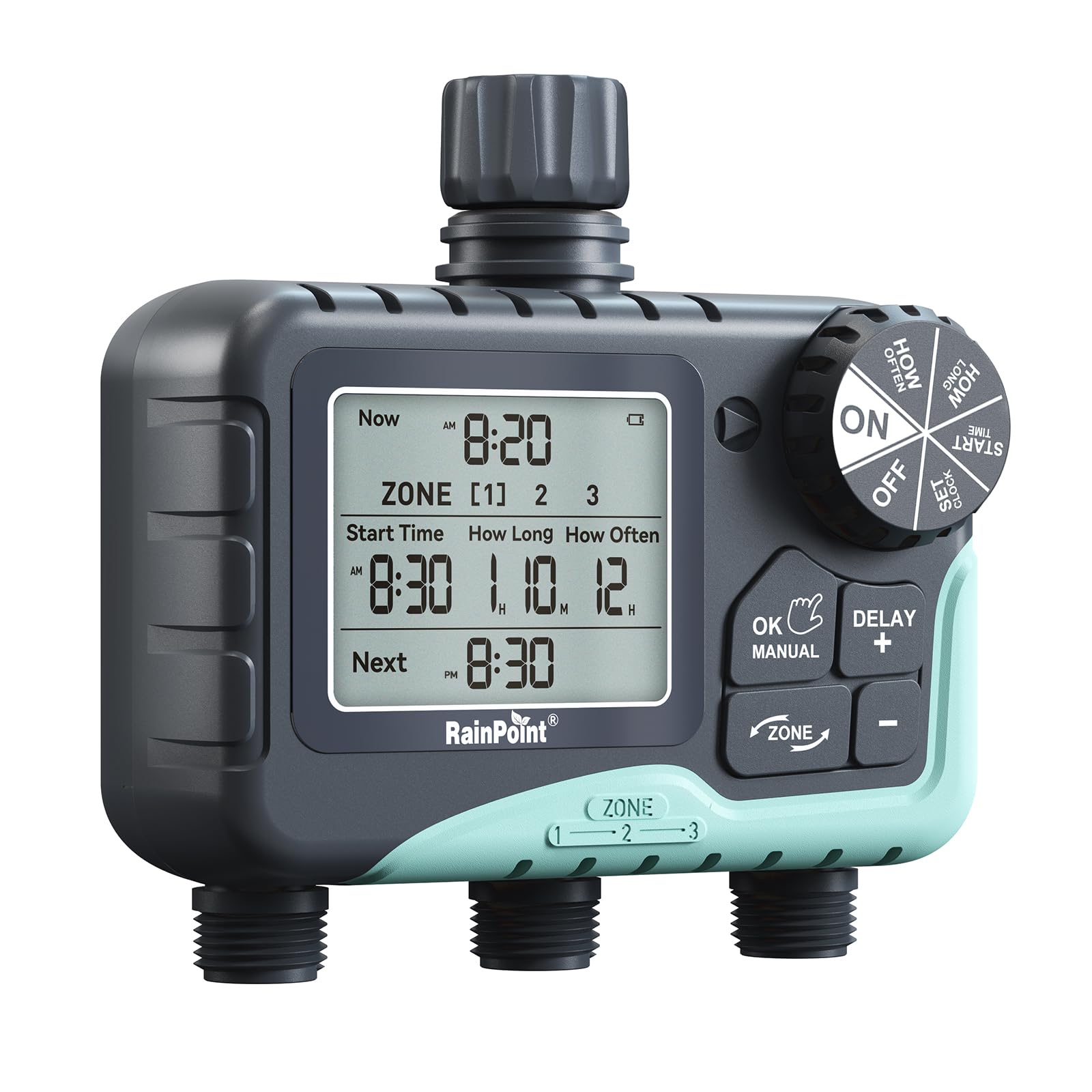 RAINPOINT Temporizador de riego de 3 zonas, temporizador de agua programable para manguera de jardín, temporizador de grifo de man
