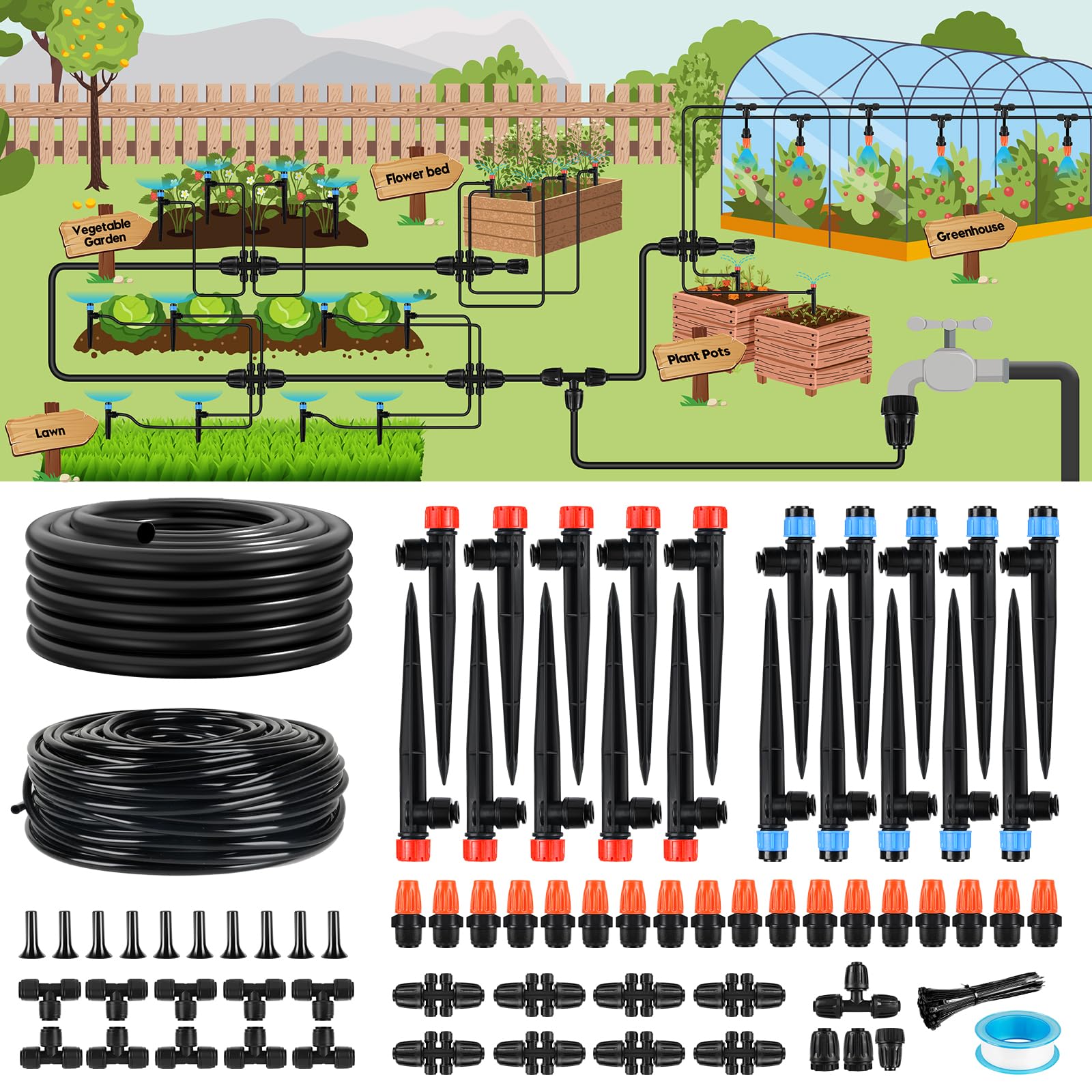 Bonviee Sistema de riego por goteo, sistema de riego de jardín de 230 pies con accesorios de conexión rápida, emisores de goteo aj
