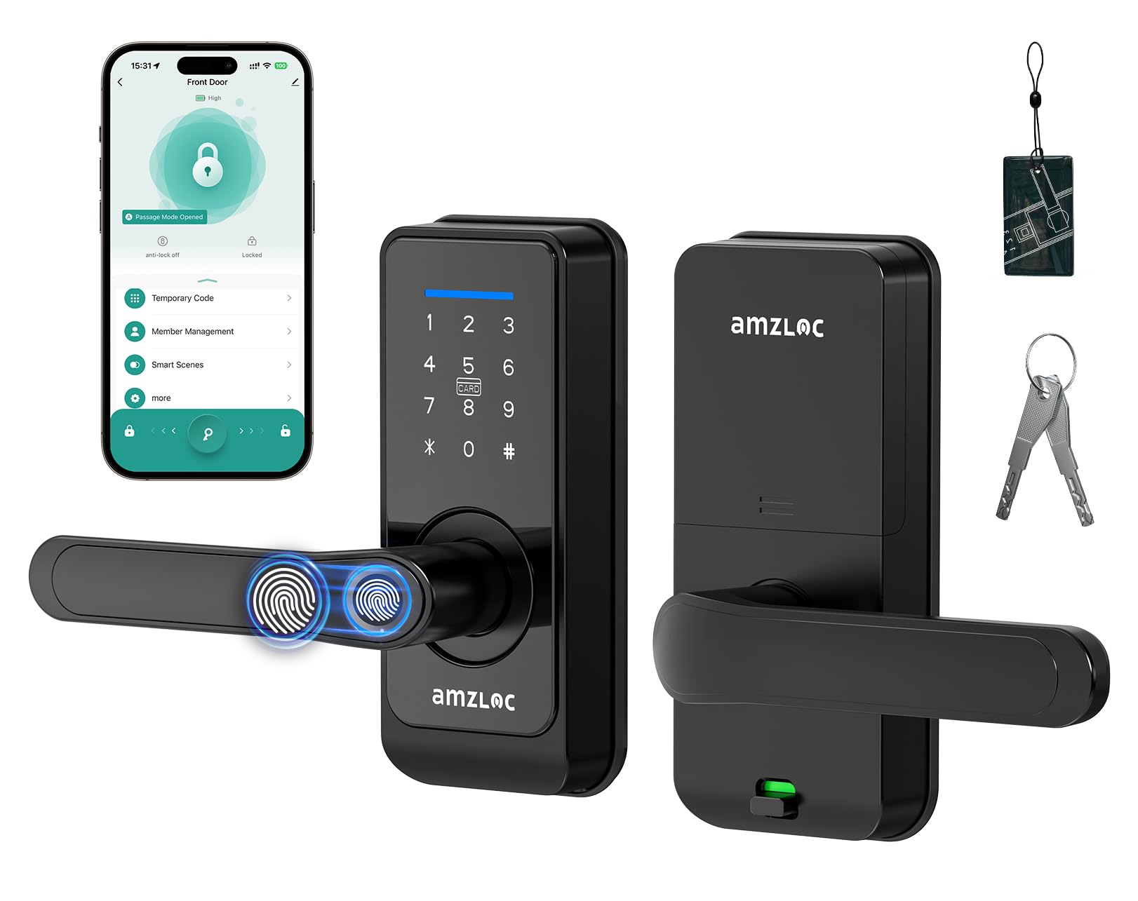 Cerradura de puerta de entrada sin llave con asa: cerradura inteligente de huellas dactilares AMZLOC con teclado, control de aplic