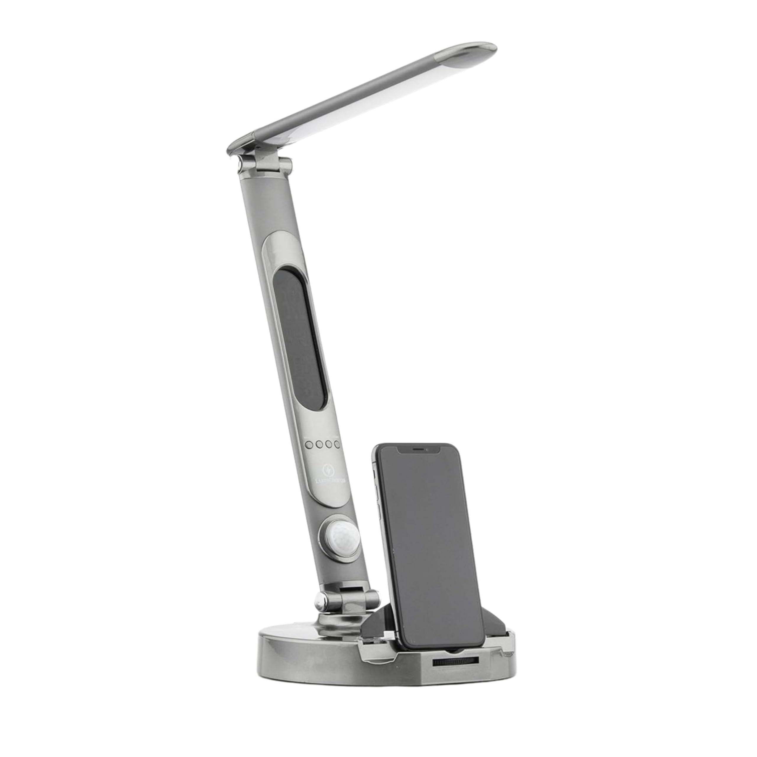 Lámpara LED, inteligente y ajustable de escritorio con base de carga universal para teléfono de LumiCharge. Control táctil de 3 to