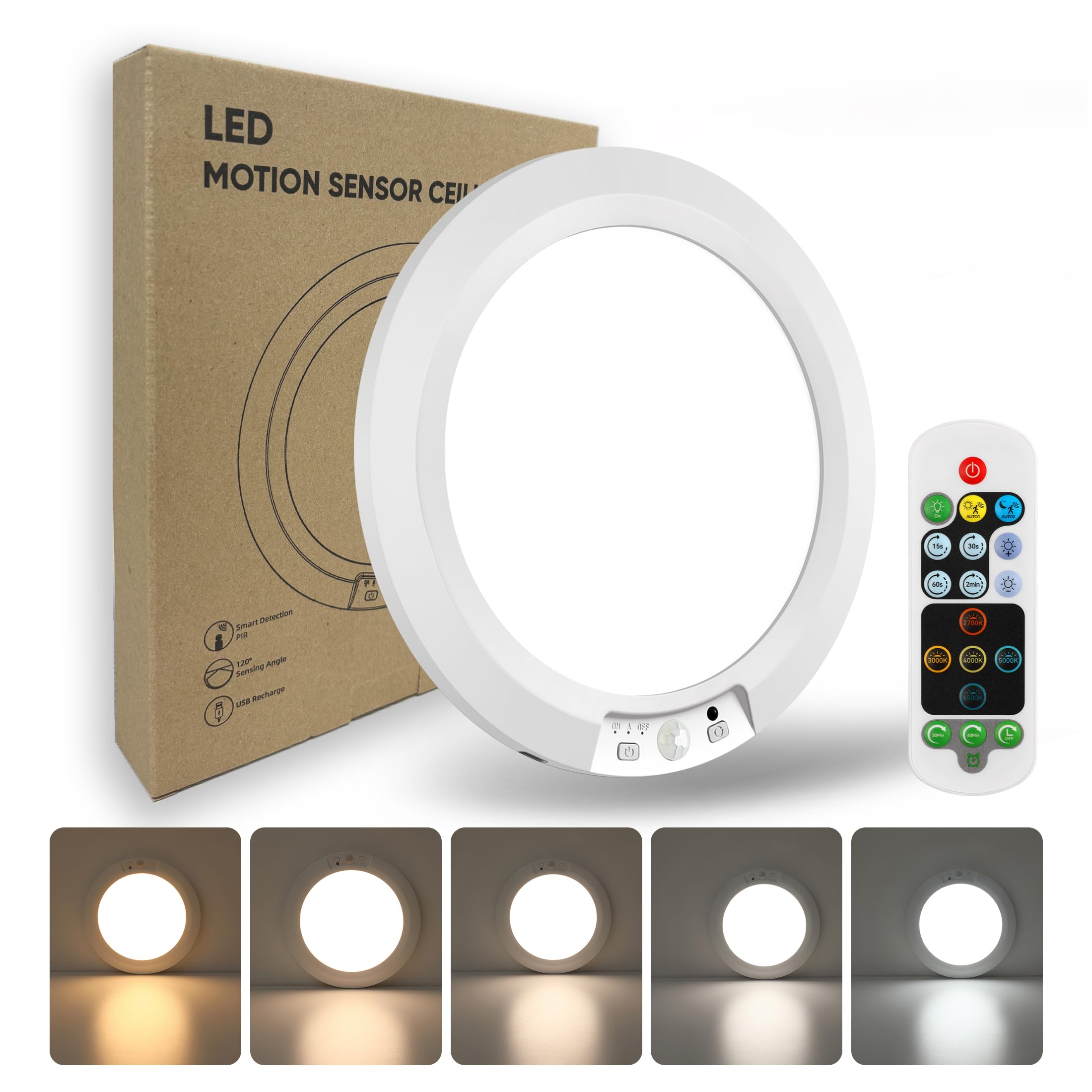Lámpara de techo recargable con sensor de movimiento ultrafina de 7.5 pulgadas con control remoto, funciona con batería de 8000 mA