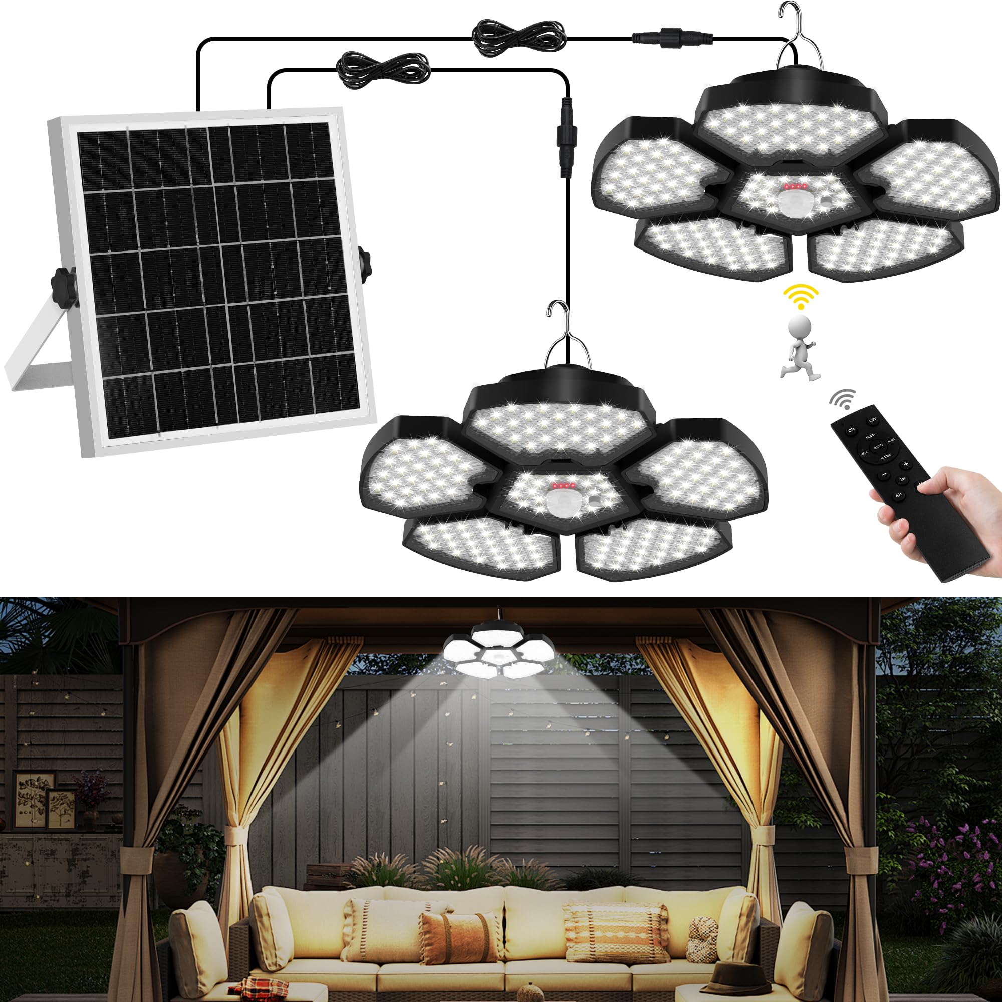 T-SUN Luces solares para interiores y exteriores, con sensor de movimiento, luces colgantes con 5 modos de control remoto, lámpara