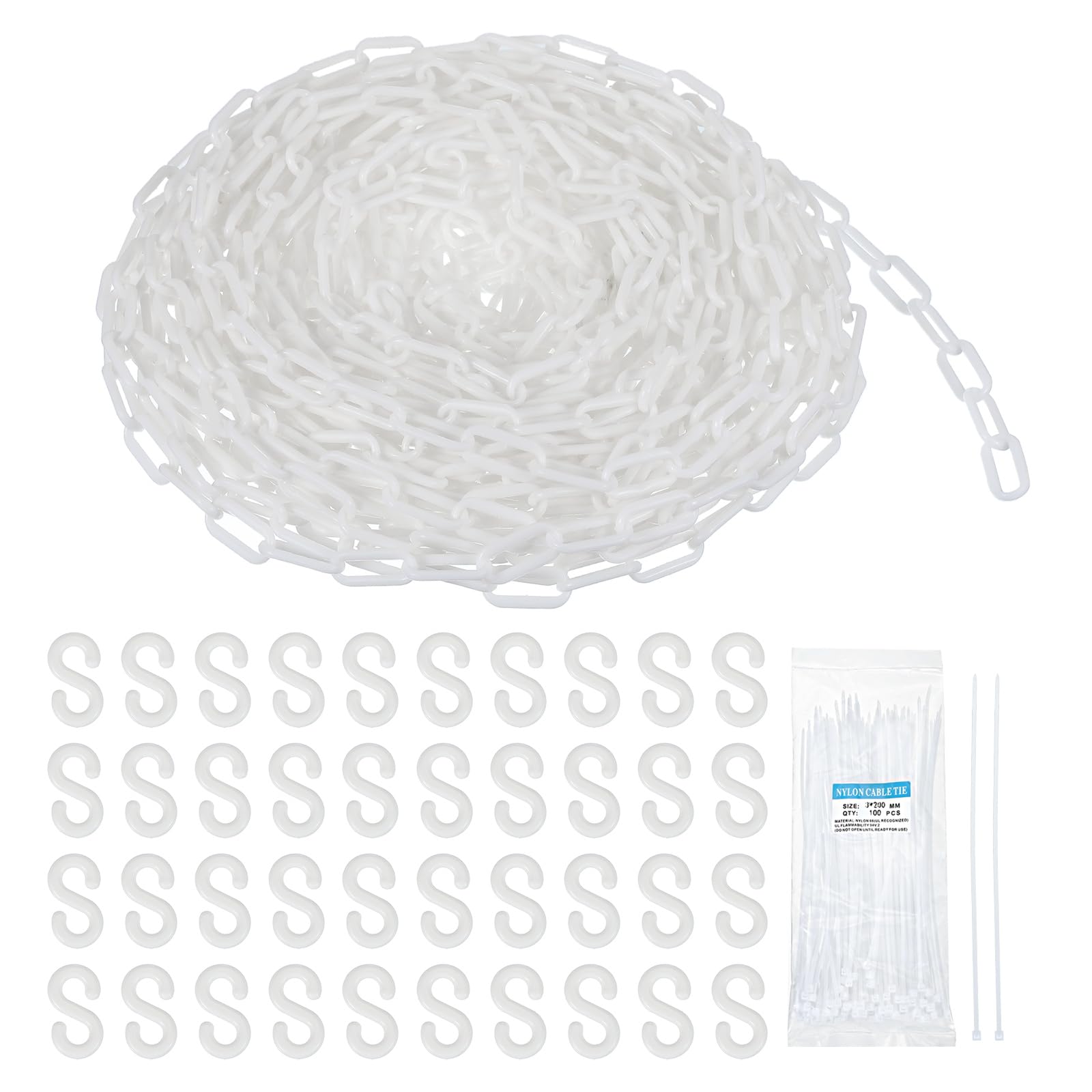 MECCANIXITY Cadena de plástico de 200 pies/200.1 ft, cadena de seguridad de plástico blanco con bridas y ganchos en S para decorac