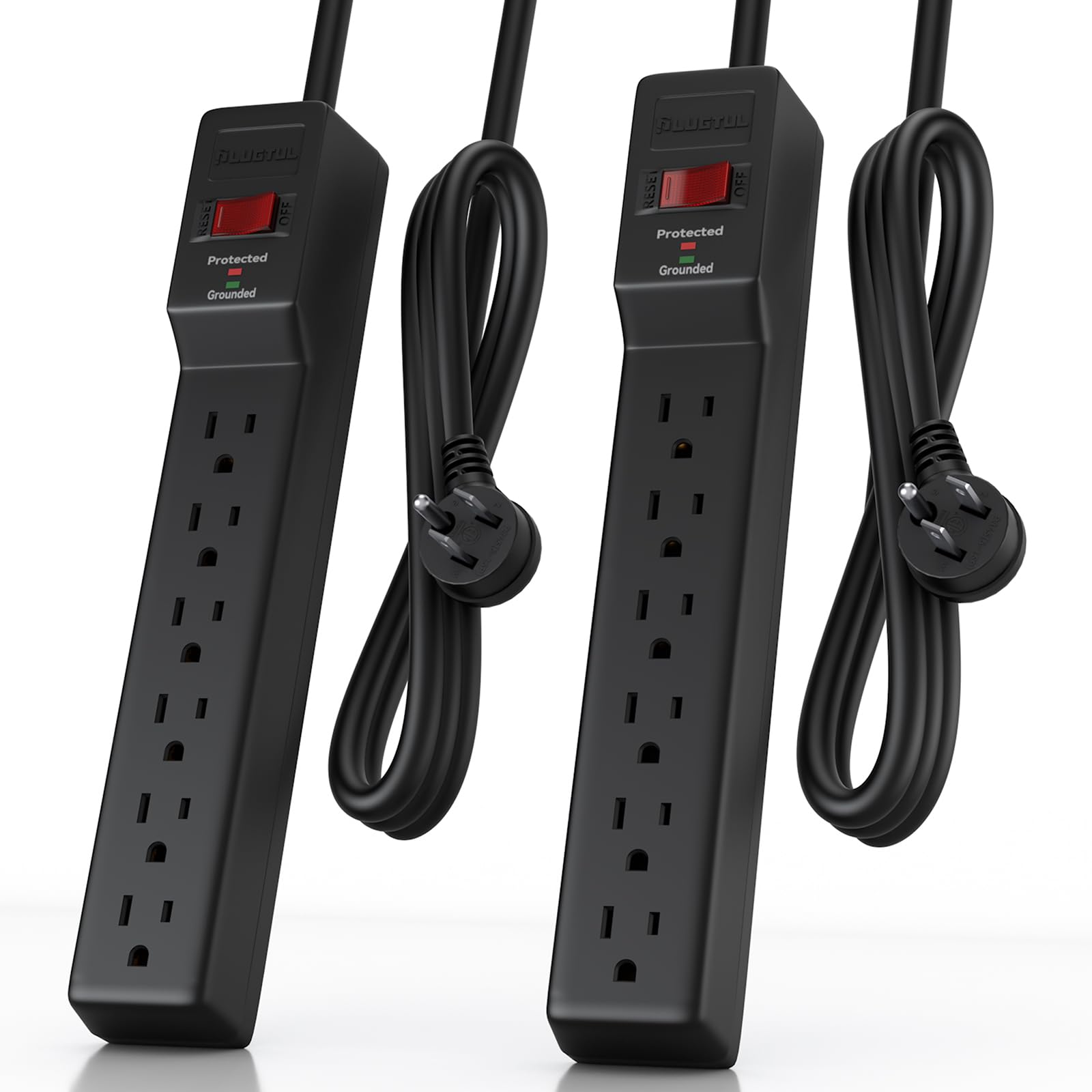 Paquete de 2 regletas protectoras contra sobretensiones de 4 pies, 6 tomas, 980 julios, enchufe plano, montaje en pared para garaj