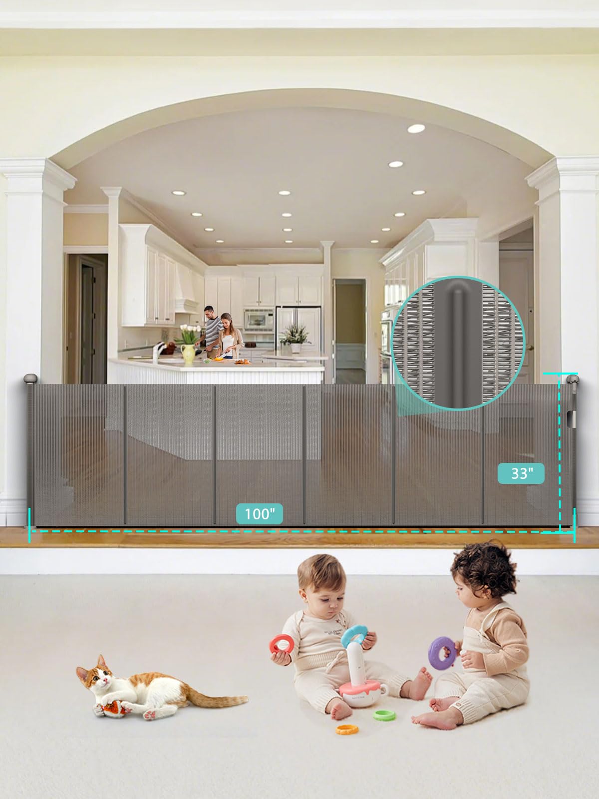 Puertas retráctiles para bebés con 5 tiras reforzadas, 100 pulgadas extra anchas de malla de un lado para perros y gatos para gran