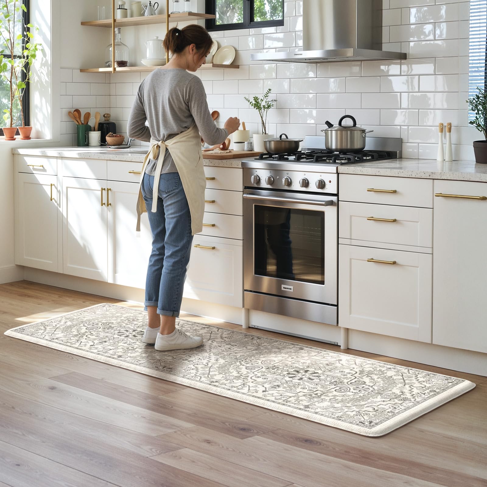 KIMDOE – Tapete de cocina bohemio acolchado antifatiga, antideslizante, impermeable, gris, de 24 x 71 pulgadas, tapete ergonómico